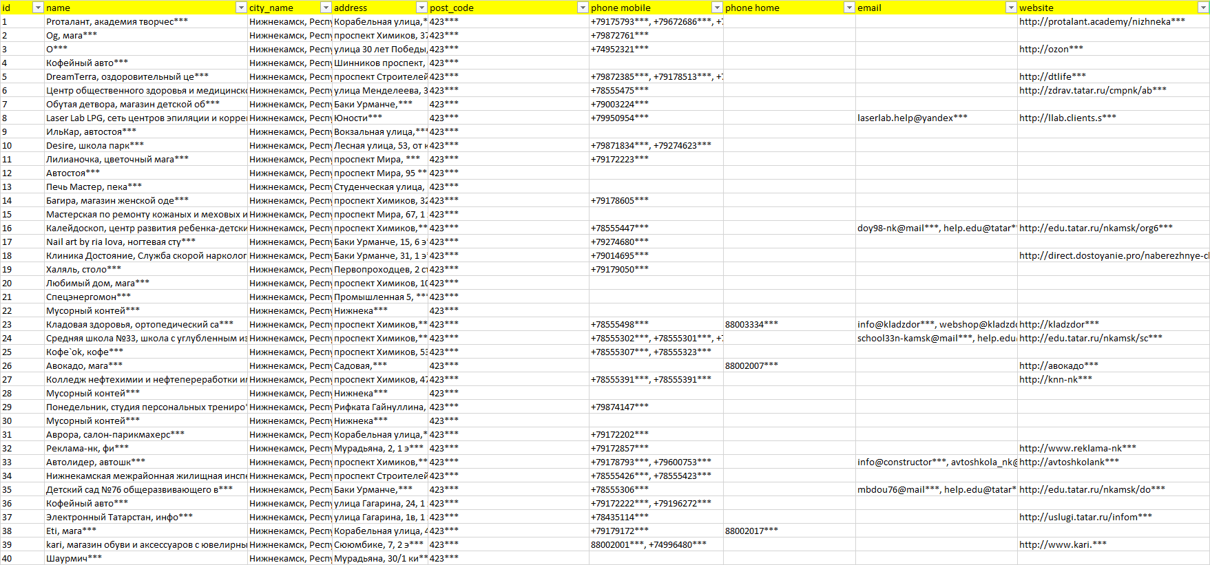 База компаний Нижнекамск, вся РФ в формате Excel с эл. почтами, телефонами, сайтами, ссылками на соц сети, координатами и другой информацией. Скачайте демо версию, чтобы ознакомиться с данными.
