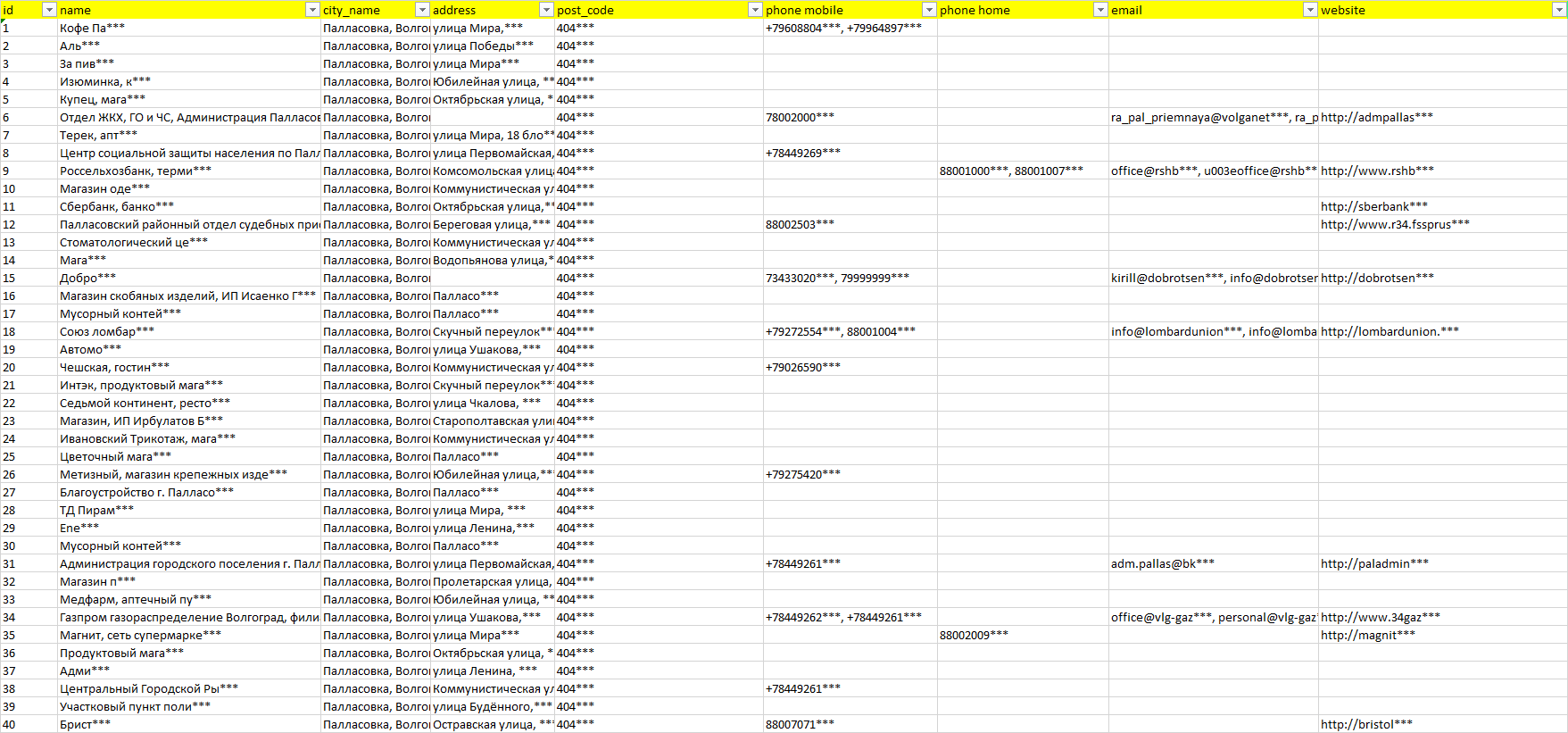 База организаций Палласовка, вся Россия в формате Excel с эл. почтами, телефонами, сайтами, ссылками на соц сети, координатами и другой информацией. Скачайте демо версию, чтобы ознакомиться с данными.