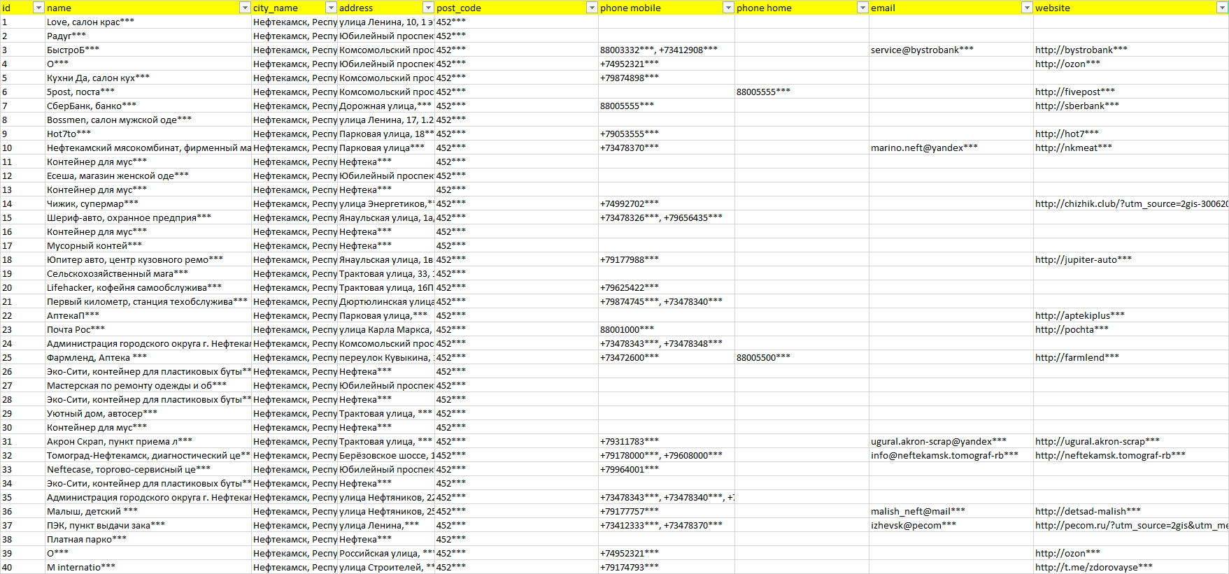 База компаний Нефтекамск, вся РФ в формате Excel с эл. почтами, телефонами, сайтами, ссылками на соц сети, координатами и другой информацией. Скачайте демо версию, чтобы ознакомиться с данными.