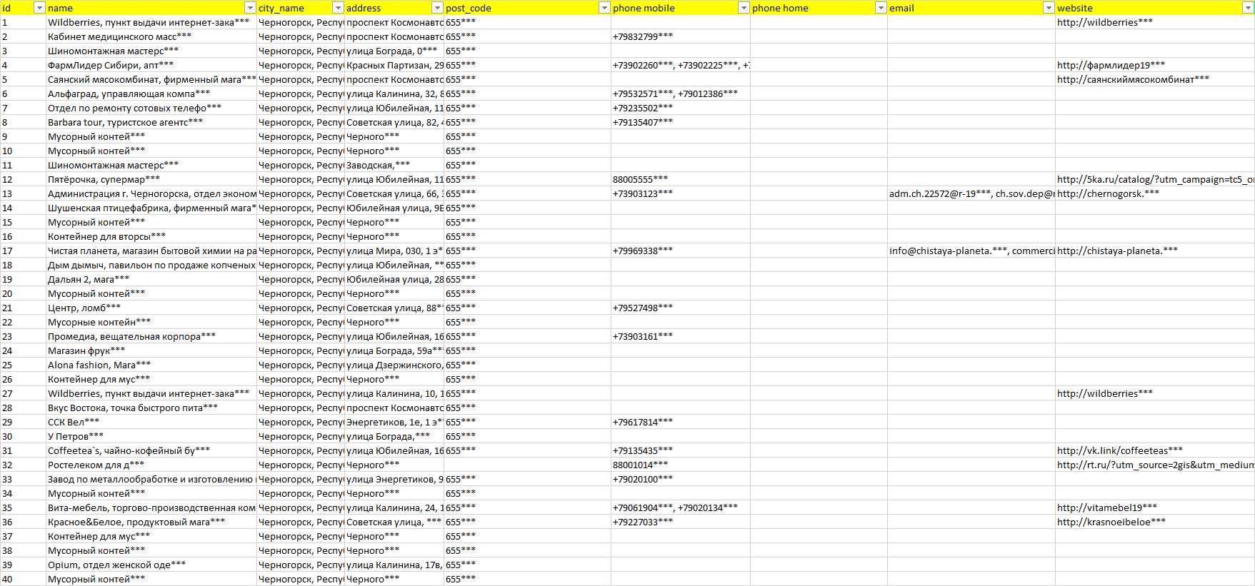 База организаций Черногорск, вся Россия в формате Excel с эл. почтами, телефонами, сайтами, ссылками на соц сети, координатами и другой информацией. Скачайте демо версию, чтобы ознакомиться с данными.
