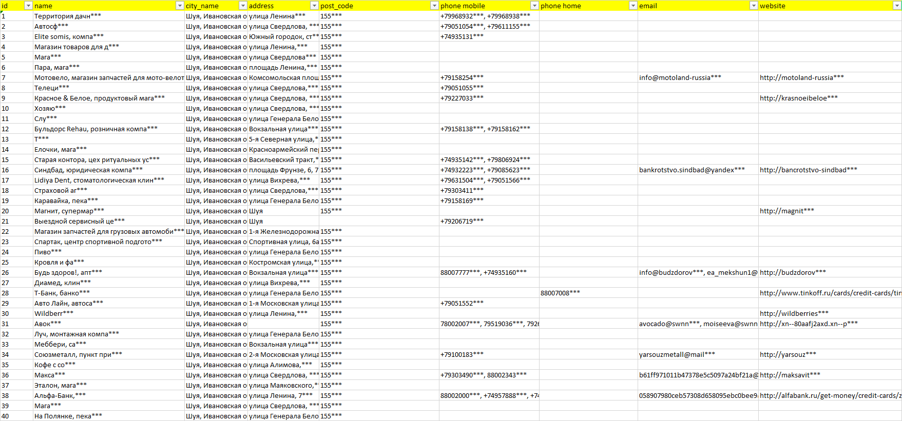 База организаций Шуя, вся Россия в формате Excel с эл. почтами, телефонами, сайтами, ссылками на соц сети, координатами и другой информацией. Скачайте демо версию, чтобы ознакомиться с данными.