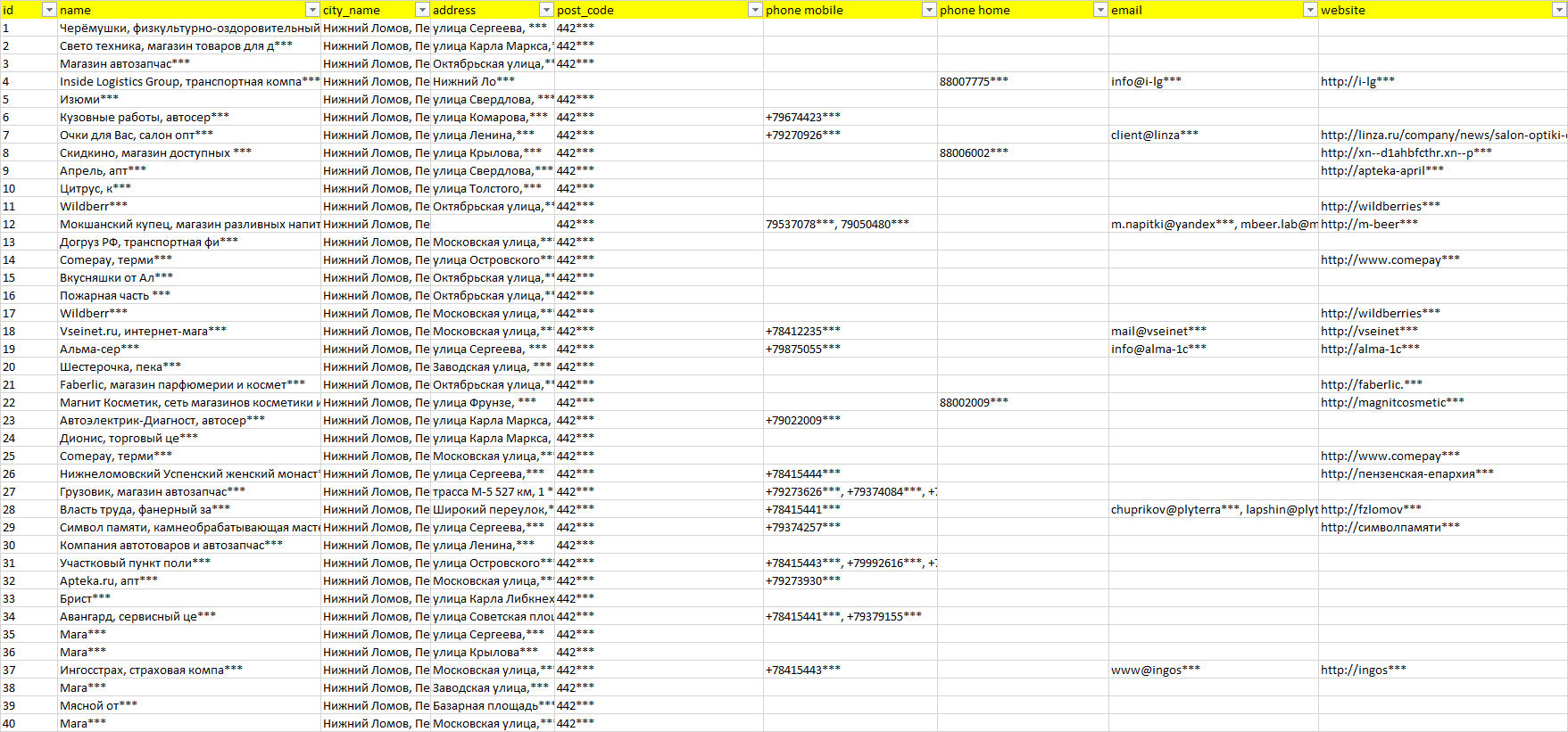 База компаний Нижний Ломов, вся РФ в формате Excel с эл. почтами, телефонами, сайтами, ссылками на соц сети, координатами и другой информацией. Скачайте демо версию, чтобы ознакомиться с данными.