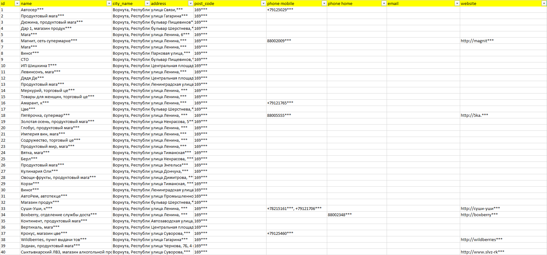 База организаций Воркута, вся Россия в формате Excel с эл. почтами, телефонами, сайтами, ссылками на соц сети, координатами и другой информацией. Скачайте демо версию, чтобы ознакомиться с данными.