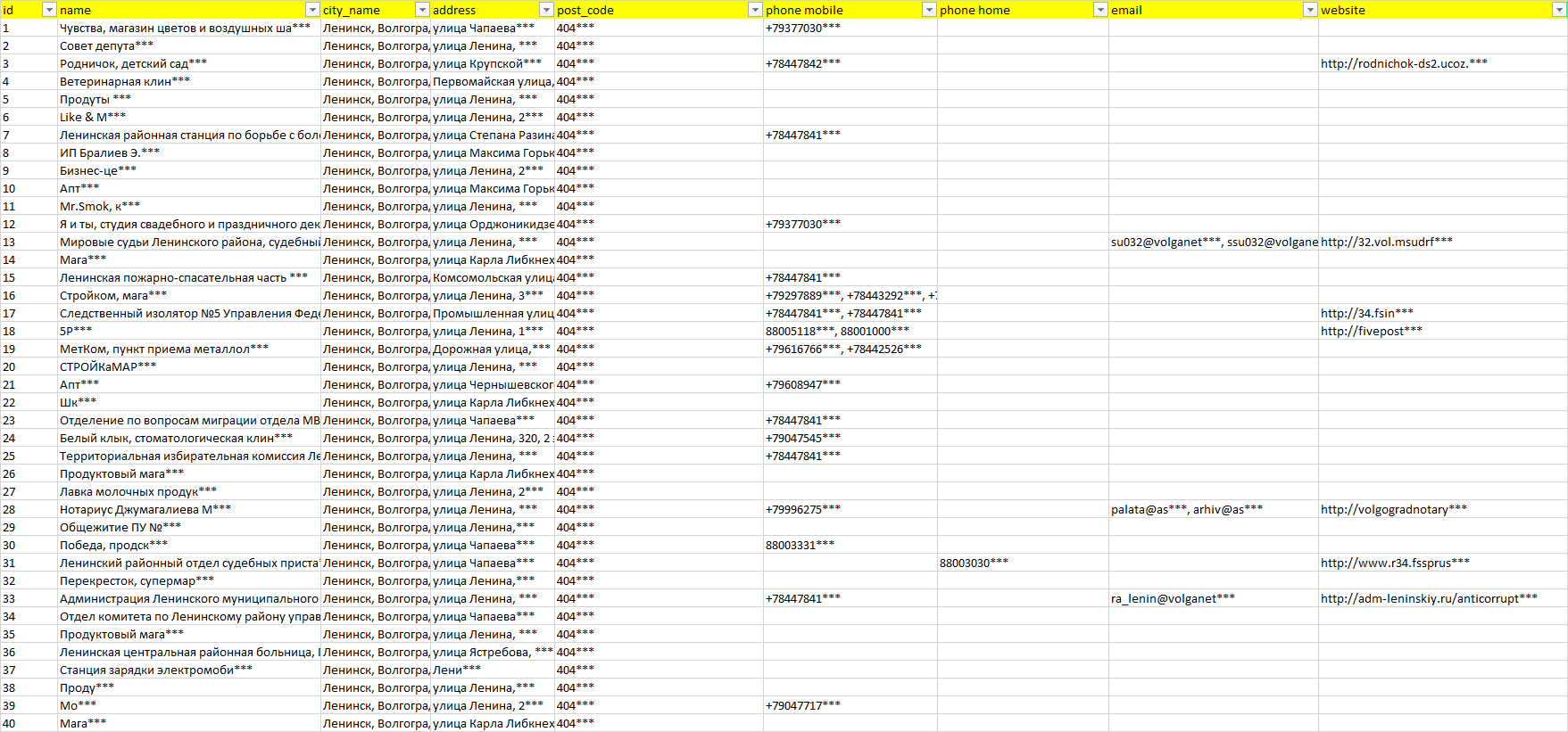 База компаний Ленинск, вся РФ в формате Excel с эл. почтами, телефонами, сайтами, ссылками на соц сети, координатами и другой информацией. Скачайте демо версию, чтобы ознакомиться с данными.