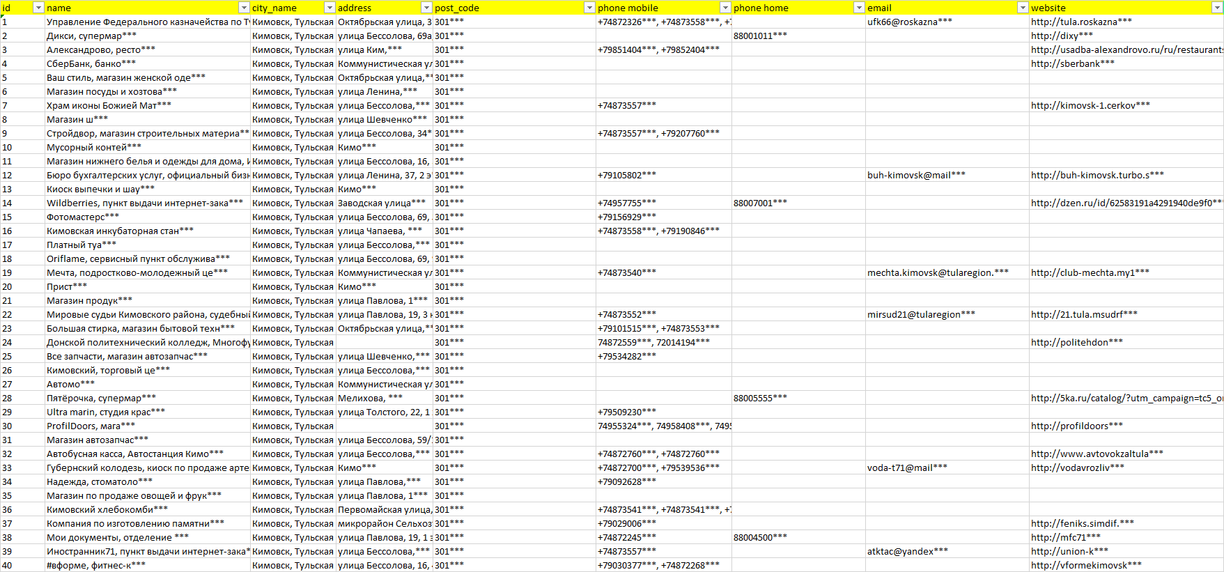 База компаний Кимовск, вся РФ в формате Excel с эл. почтами, телефонами, сайтами, ссылками на соц сети, координатами и другой информацией. Скачайте демо версию, чтобы ознакомиться с данными.