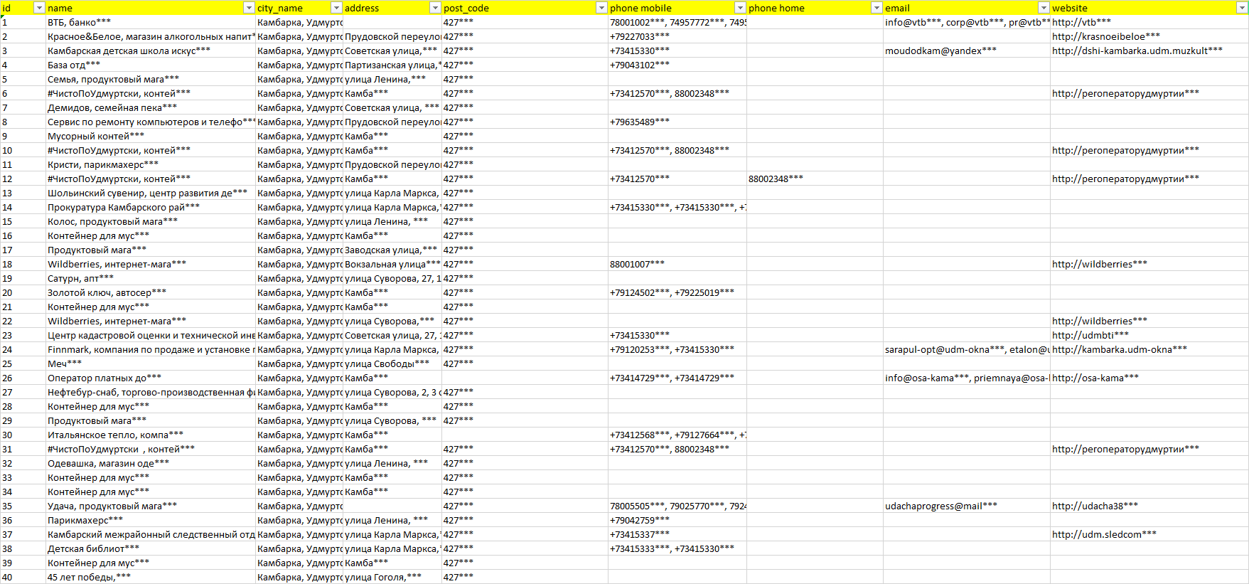 База организаций Камбарка, вся Россия в формате Excel с эл. почтами, телефонами, сайтами, ссылками на соц сети, координатами и другой информацией. Скачайте демо версию, чтобы ознакомиться с данными.