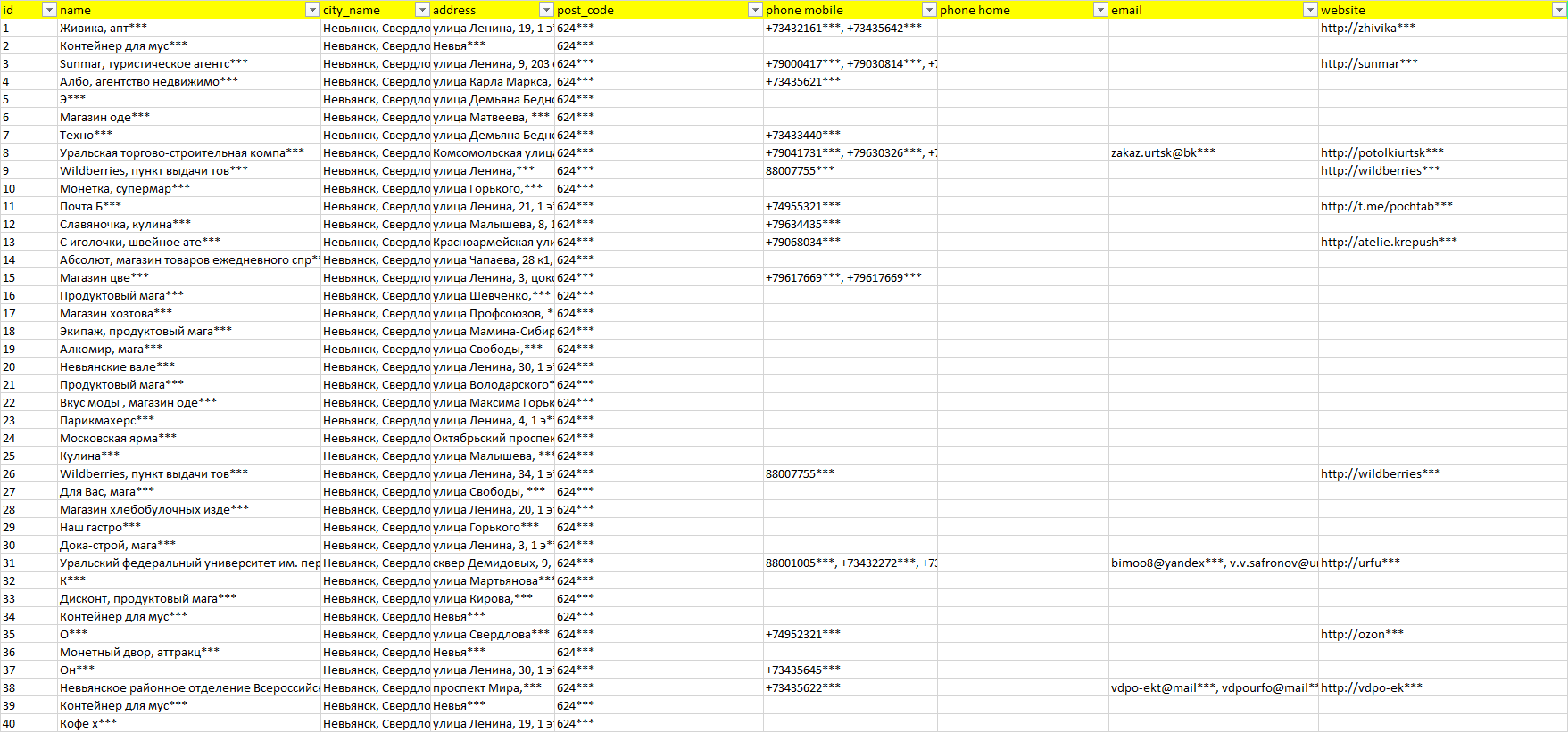 База компаний Невьянск, вся РФ в формате Excel с эл. почтами, телефонами, сайтами, ссылками на соц сети, координатами и другой информацией. Скачайте демо версию, чтобы ознакомиться с данными.