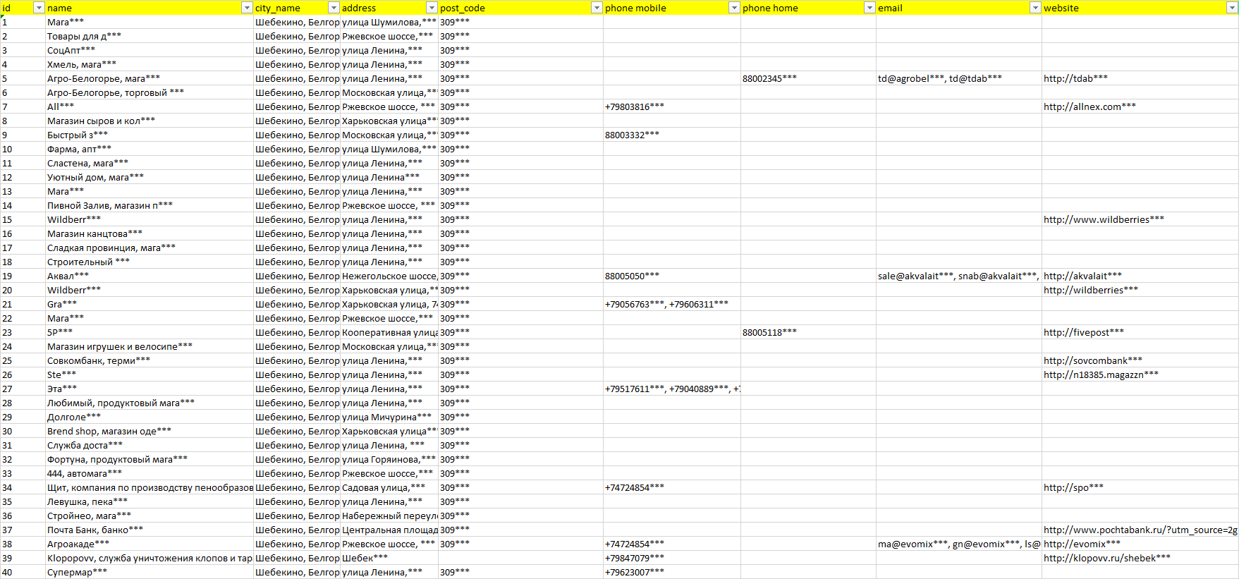 База компаний Шебекино, вся РФ в формате Excel с эл. почтами, телефонами, сайтами, ссылками на соц сети, координатами и другой информацией. Скачайте демо версию, чтобы ознакомиться с данными.