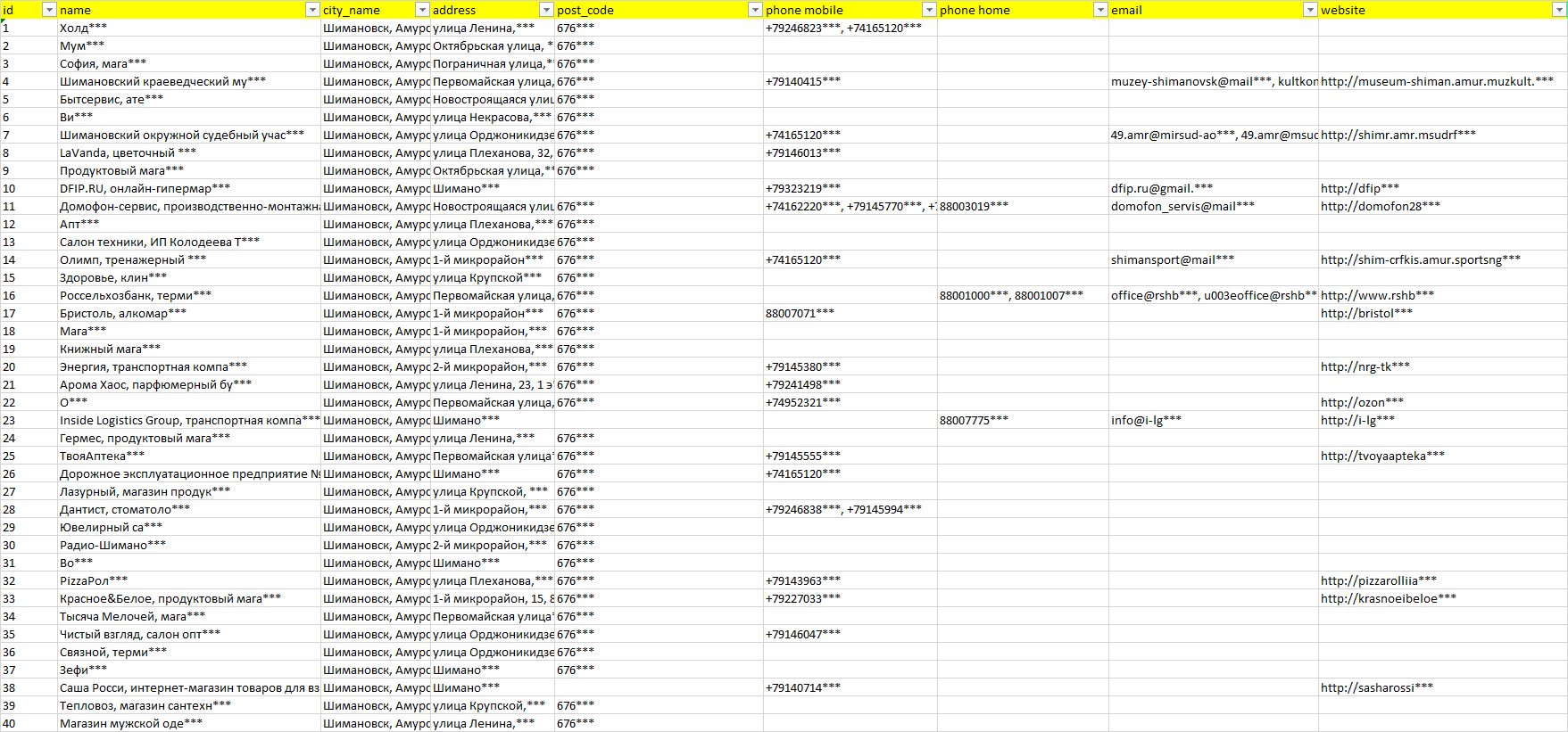 База организаций Шимановск, вся Россия в формате Excel с эл. почтами, телефонами, сайтами, ссылками на соц сети, координатами и другой информацией. Скачайте демо версию, чтобы ознакомиться с данными.