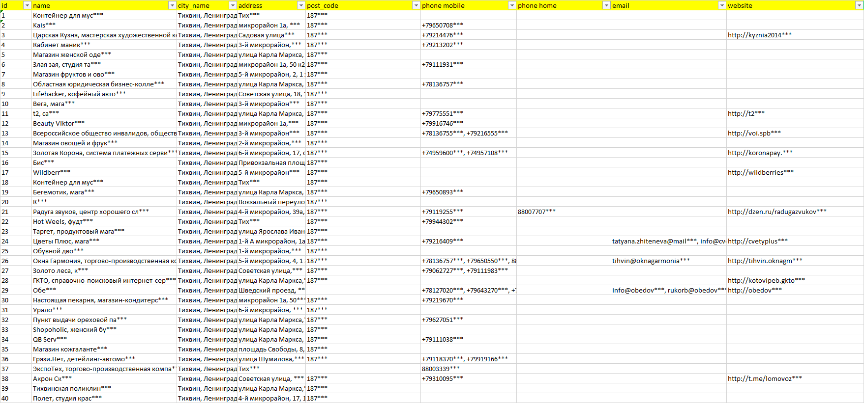 База организаций Тихвин, вся Россия в формате Excel с эл. почтами, телефонами, сайтами, ссылками на соц сети, координатами и другой информацией. Скачайте демо версию, чтобы ознакомиться с данными.