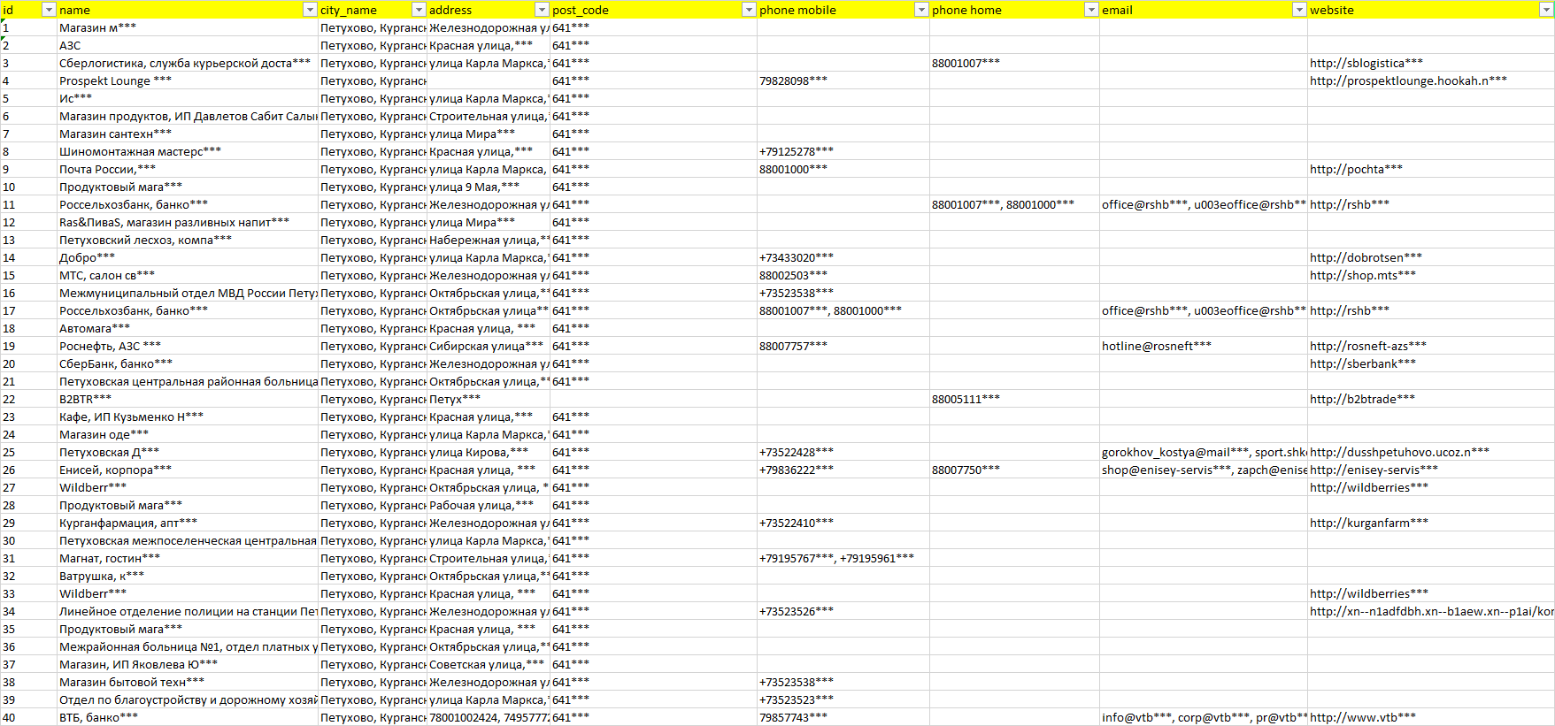 База организаций Петухово, вся Россия в формате Excel с эл. почтами, телефонами, сайтами, ссылками на соц сети, координатами и другой информацией. Скачайте демо версию, чтобы ознакомиться с данными.
