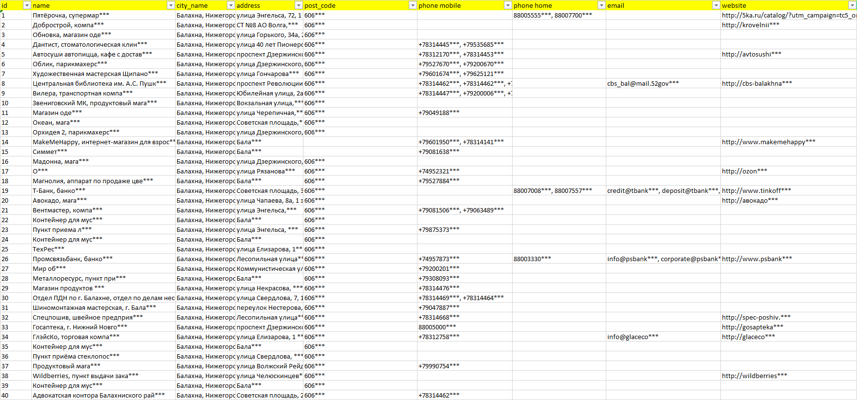 База организаций Балахна, вся Россия в формате Excel с эл. почтами, телефонами, сайтами, ссылками на соц сети, координатами и другой информацией. Скачайте демо версию, чтобы ознакомиться с данными.