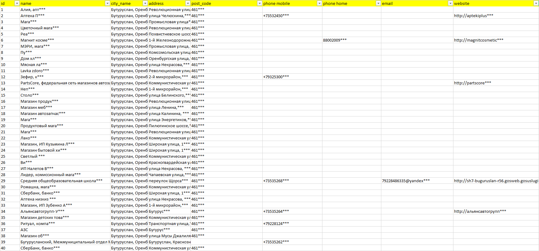 База организаций Бугуруслан, вся Россия в формате Excel с эл. почтами, телефонами, сайтами, ссылками на соц сети, координатами и другой информацией. Скачайте демо версию, чтобы ознакомиться с данными.