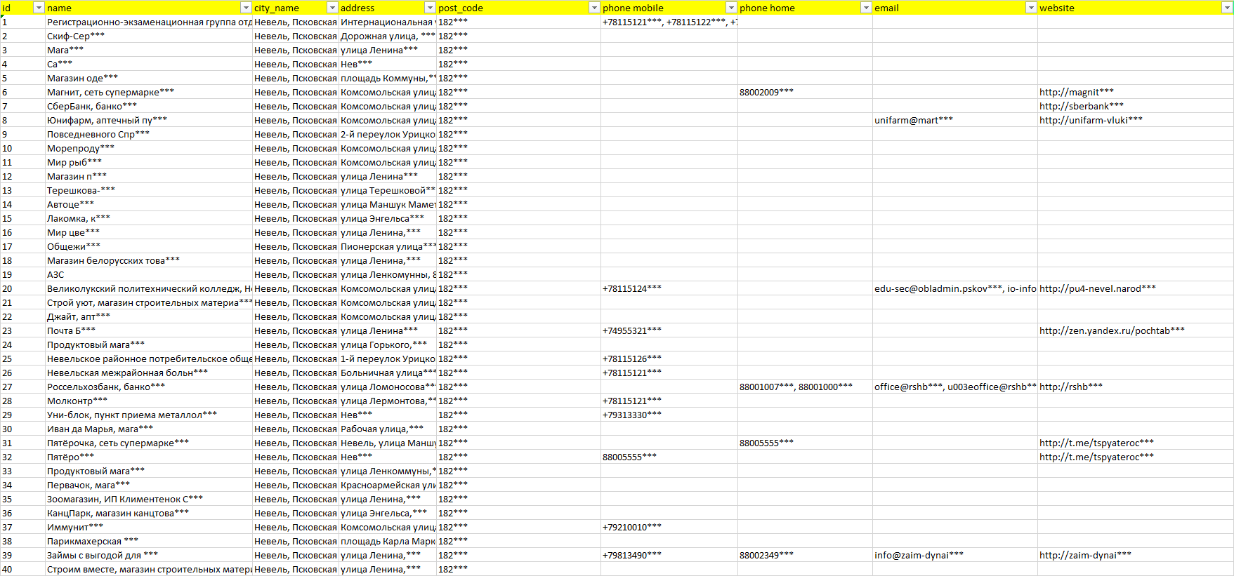 База компаний Невель, вся РФ в формате Excel с эл. почтами, телефонами, сайтами, ссылками на соц сети, координатами и другой информацией. Скачайте демо версию, чтобы ознакомиться с данными.