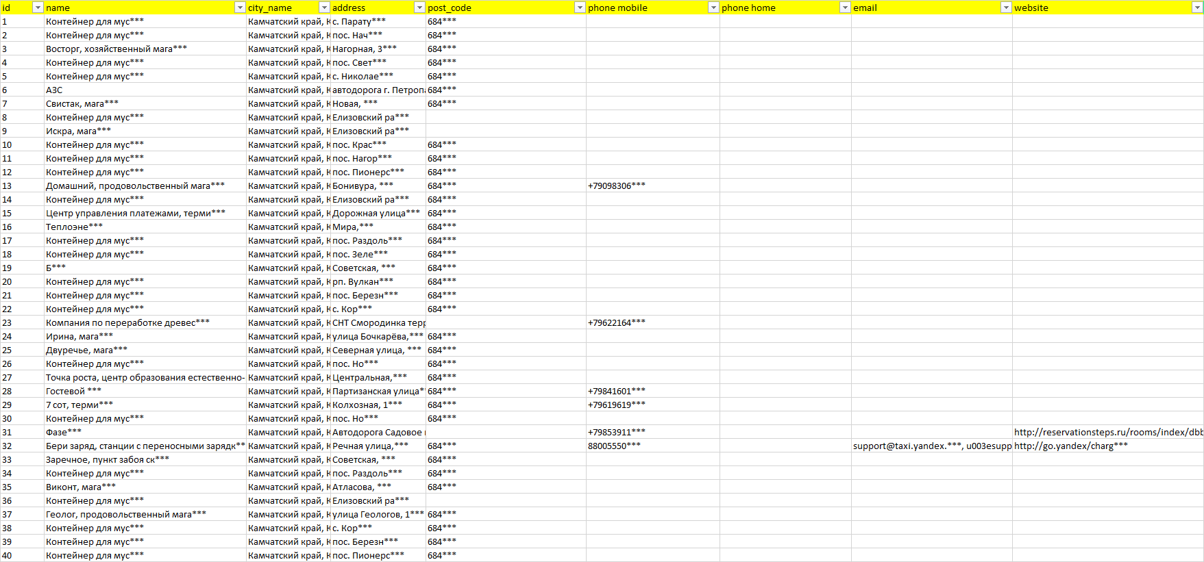 База организаций Камчатский край, вся Россия в формате Excel с эл. почтами, телефонами, сайтами, ссылками на соц сети, координатами и другой информацией. Скачайте демо версию, чтобы ознакомиться с данными.