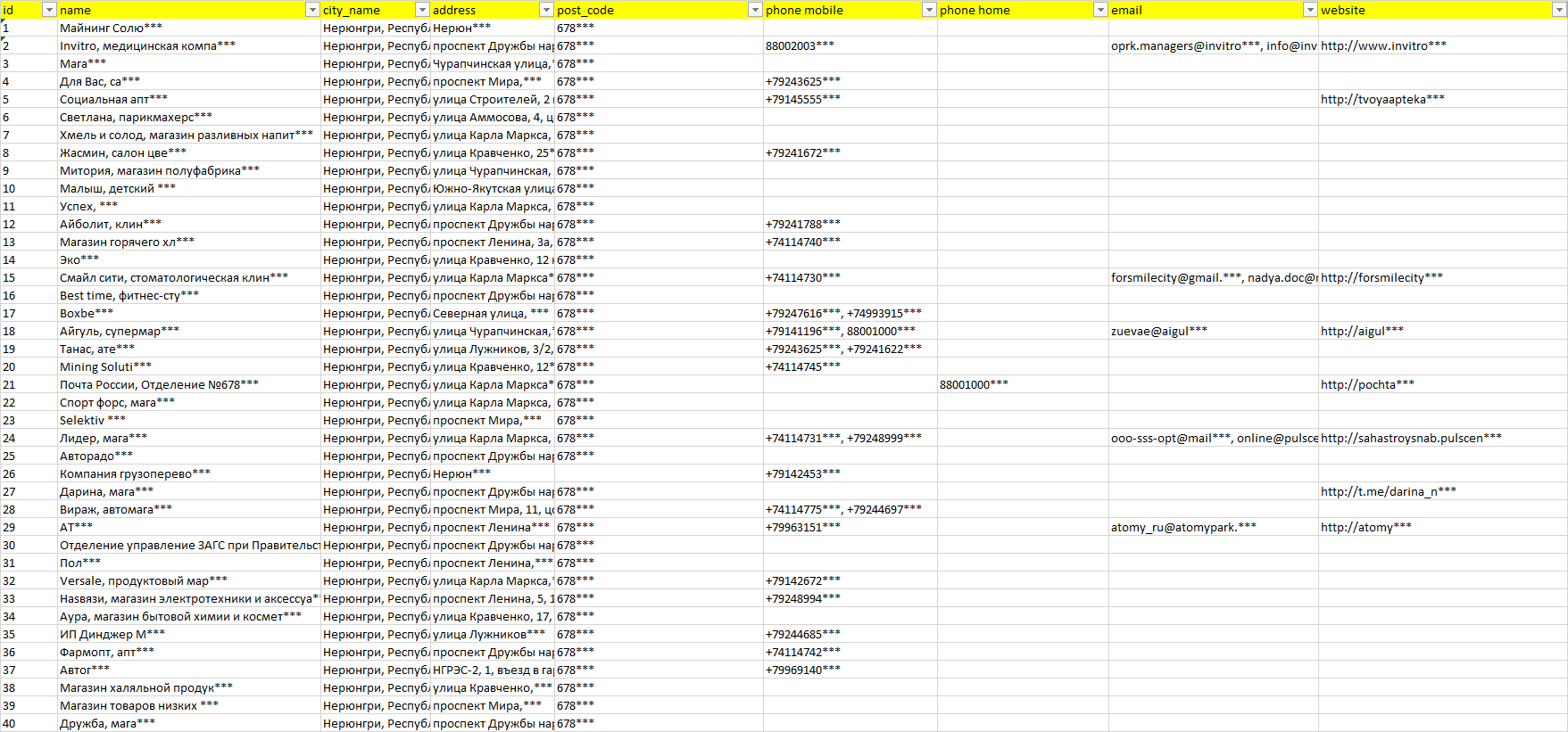 База организаций Нерюнгри, вся Россия в формате Excel с эл. почтами, телефонами, сайтами, ссылками на соц сети, координатами и другой информацией. Скачайте демо версию, чтобы ознакомиться с данными.