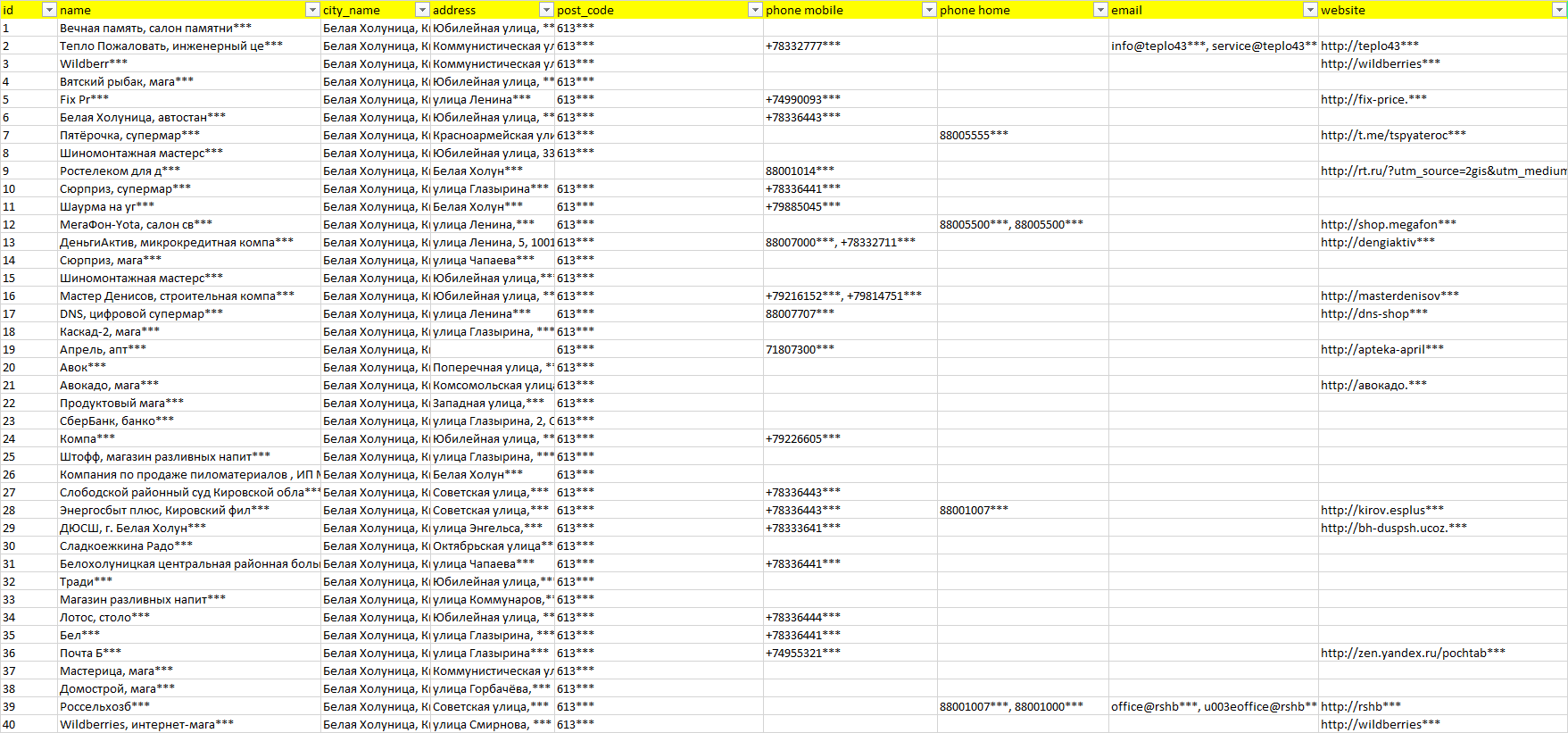 База организаций Белая Холуница, вся Россия в формате Excel с эл. почтами, телефонами, сайтами, ссылками на соц сети, координатами и другой информацией. Скачайте демо версию, чтобы ознакомиться с данными.