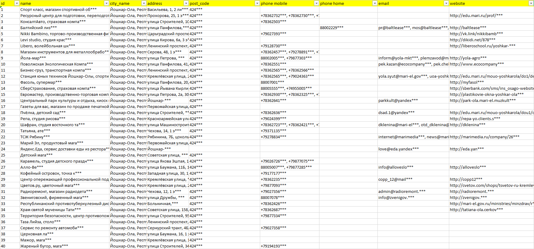 База компаний Йошкар-Ола, вся РФ в формате Excel с эл. почтами, телефонами, сайтами, ссылками на соц сети, координатами и другой информацией. Скачайте демо версию, чтобы ознакомиться с данными.