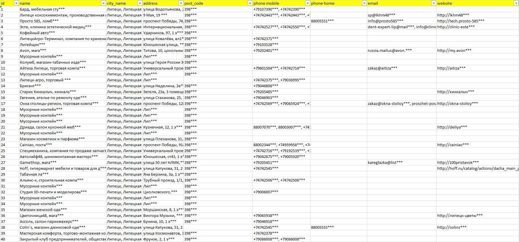 База компаний Липецк, вся РФ в формате Excel с эл. почтами, телефонами, сайтами, ссылками на соц сети, координатами и другой информацией. Скачайте демо версию, чтобы ознакомиться с данными.