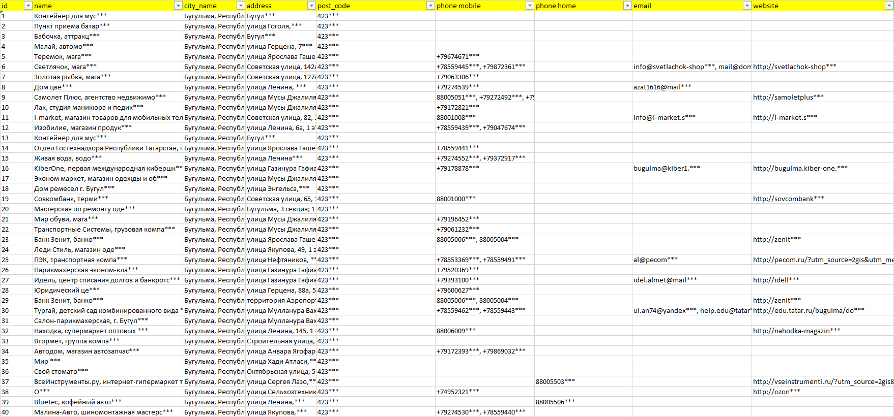 База организаций Бугульма, вся Россия в формате Excel с эл. почтами, телефонами, сайтами, ссылками на соц сети, координатами и другой информацией. Скачайте демо версию, чтобы ознакомиться с данными.