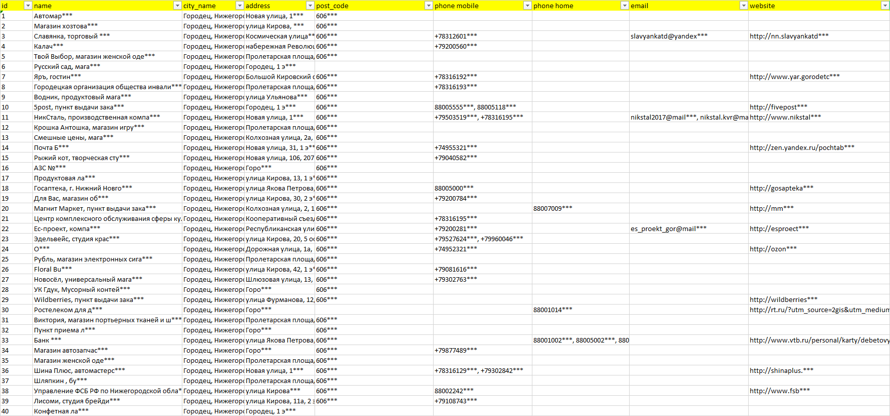 База компаний Городец, вся РФ в формате Excel с эл. почтами, телефонами, сайтами, ссылками на соц сети, координатами и другой информацией. Скачайте демо версию, чтобы ознакомиться с данными.