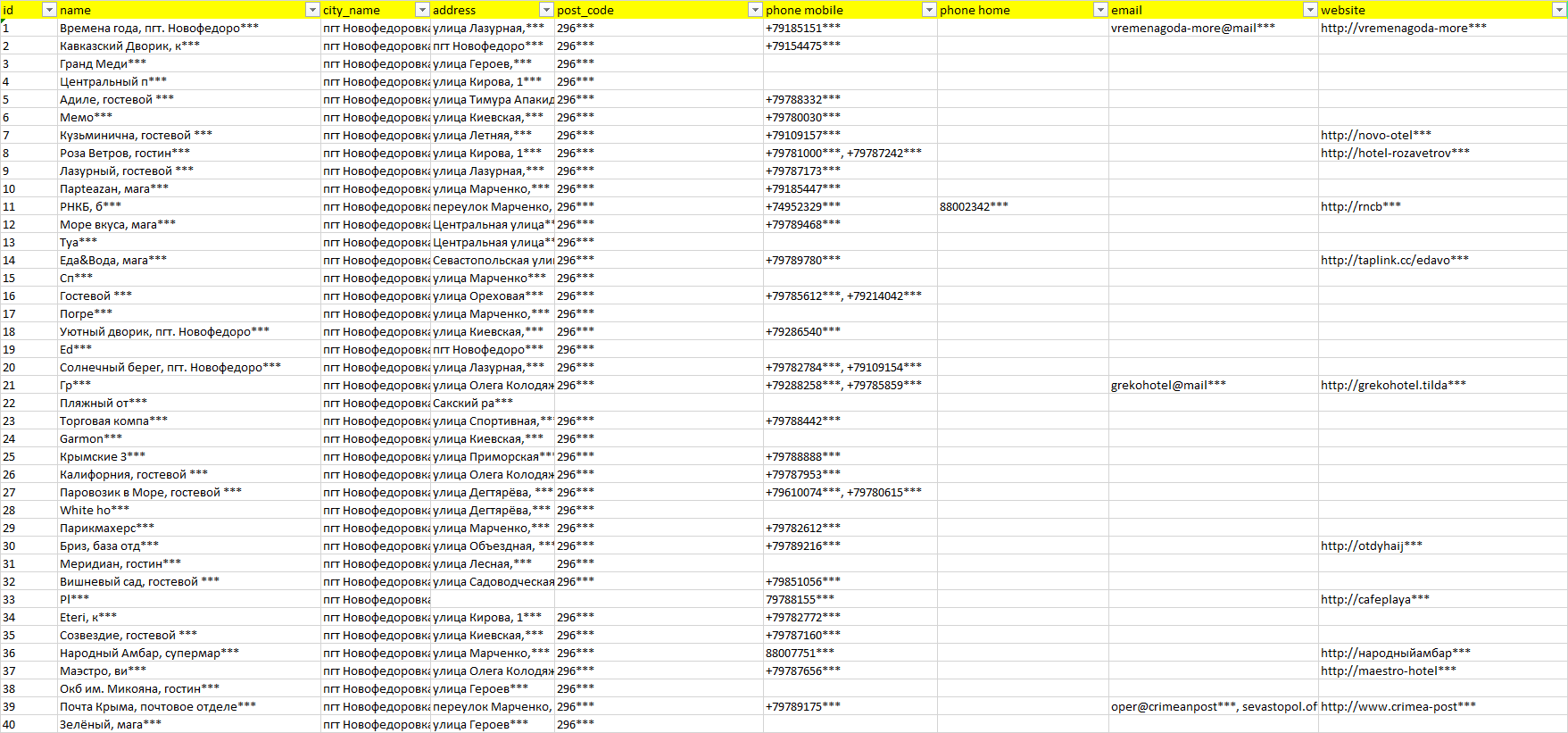 База организаций пгт Новофедоровка, вся Россия в формате Excel с эл. почтами, телефонами, сайтами, ссылками на соц сети, координатами и другой информацией. Скачайте демо версию, чтобы ознакомиться с данными.