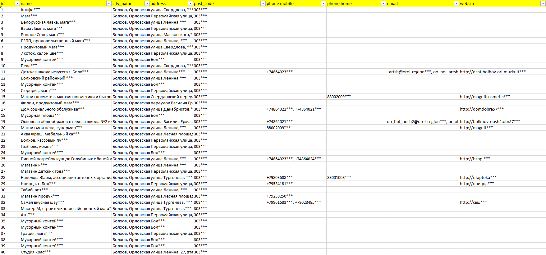 База компаний Болхов, вся РФ в формате Excel с эл. почтами, телефонами, сайтами, ссылками на соц сети, координатами и другой информацией. Скачайте демо версию, чтобы ознакомиться с данными.