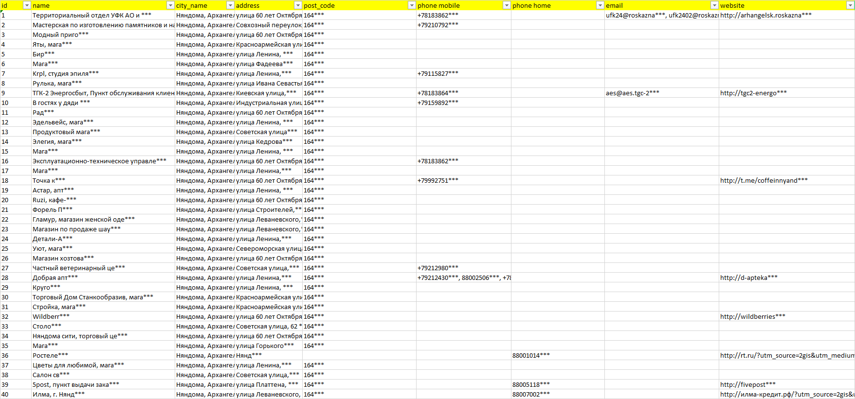База компаний Няндома, вся РФ в формате Excel с эл. почтами, телефонами, сайтами, ссылками на соц сети, координатами и другой информацией. Скачайте демо версию, чтобы ознакомиться с данными.