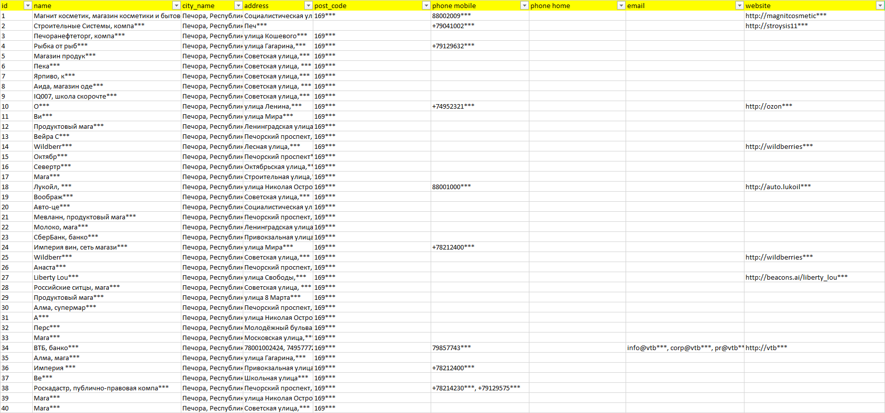 База компаний Печора, вся РФ в формате Excel с эл. почтами, телефонами, сайтами, ссылками на соц сети, координатами и другой информацией. Скачайте демо версию, чтобы ознакомиться с данными.