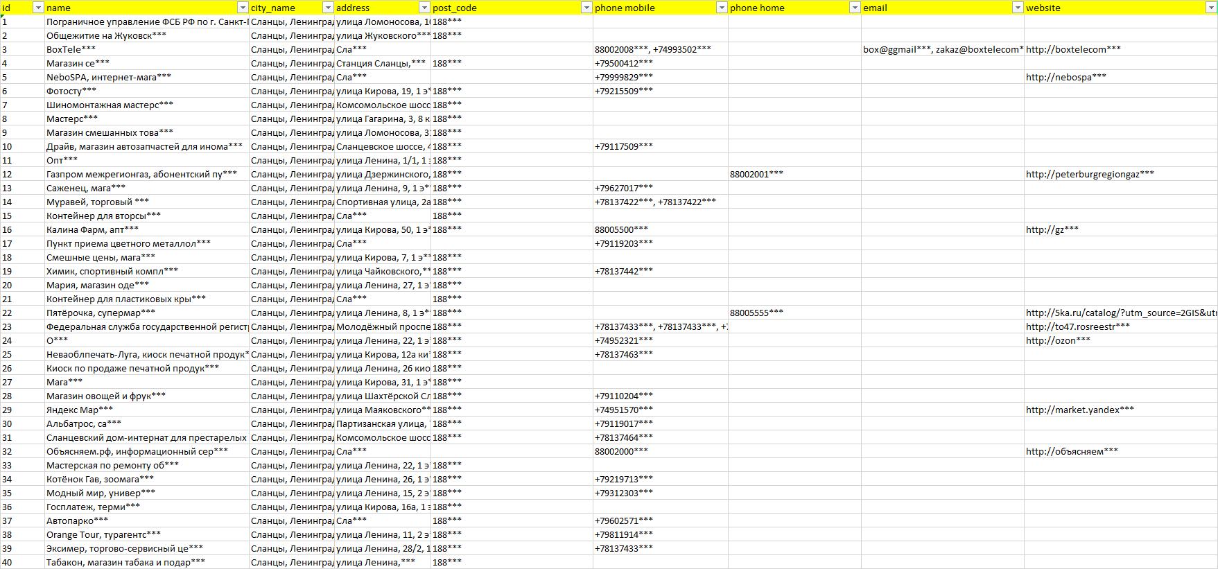 База компаний Сланцы, вся РФ в формате Excel с эл. почтами, телефонами, сайтами, ссылками на соц сети, координатами и другой информацией. Скачайте демо версию, чтобы ознакомиться с данными.