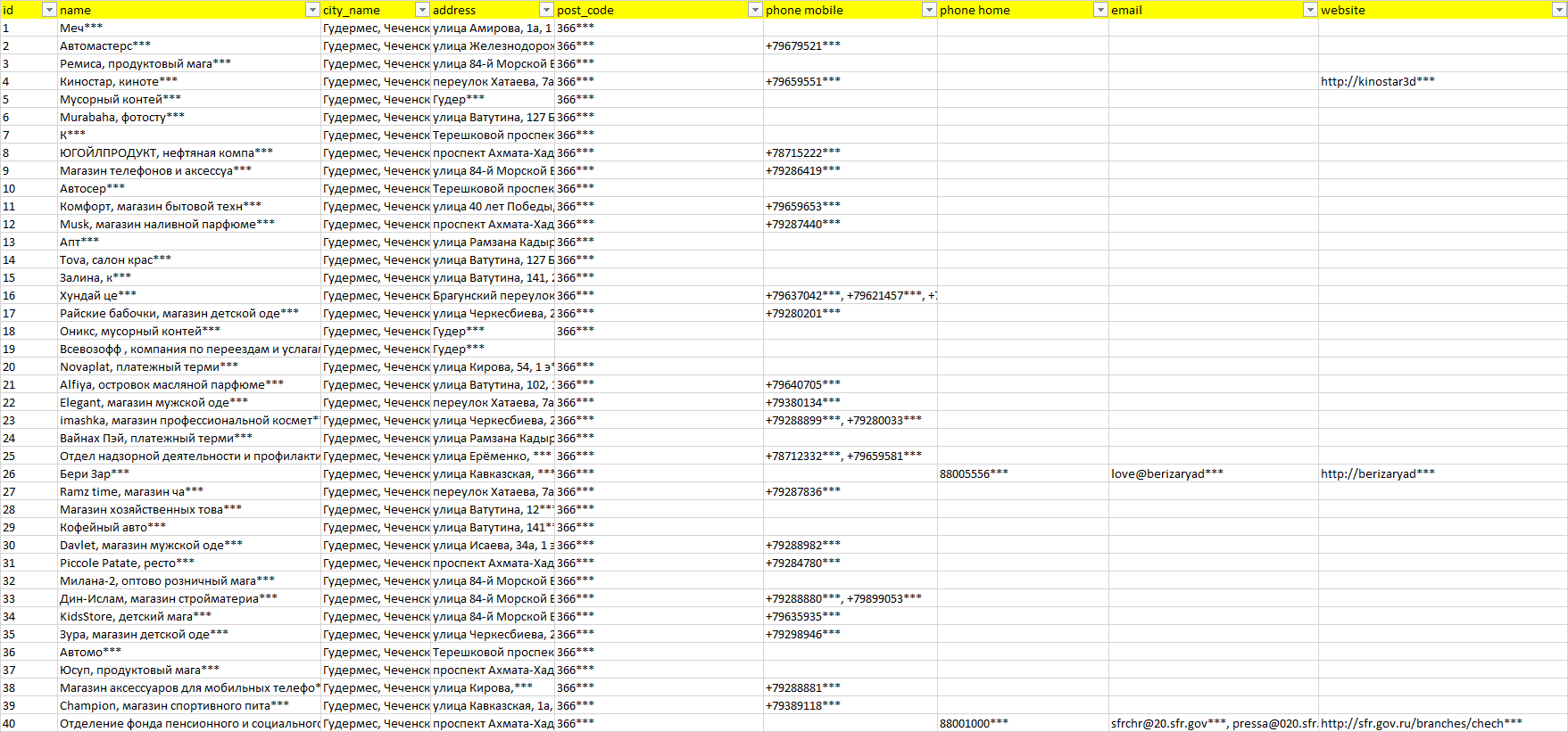 База организаций Гудермес, вся Россия в формате Excel с эл. почтами, телефонами, сайтами, ссылками на соц сети, координатами и другой информацией. Скачайте демо версию, чтобы ознакомиться с данными.