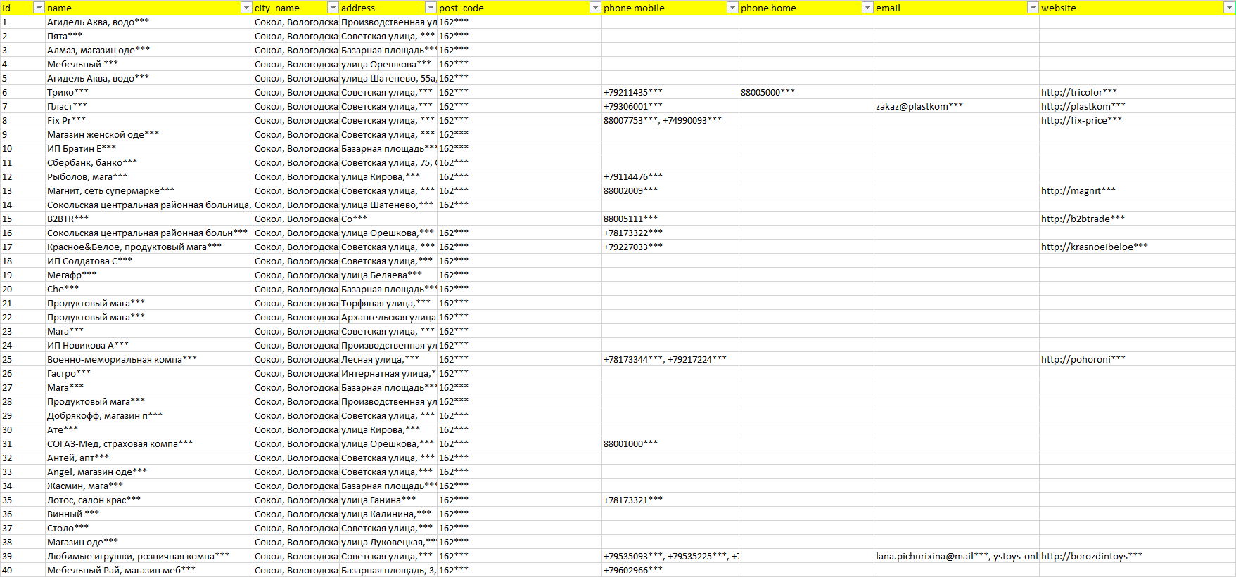 База организаций Сокол, вся Россия в формате Excel с эл. почтами, телефонами, сайтами, ссылками на соц сети, координатами и другой информацией. Скачайте демо версию, чтобы ознакомиться с данными.