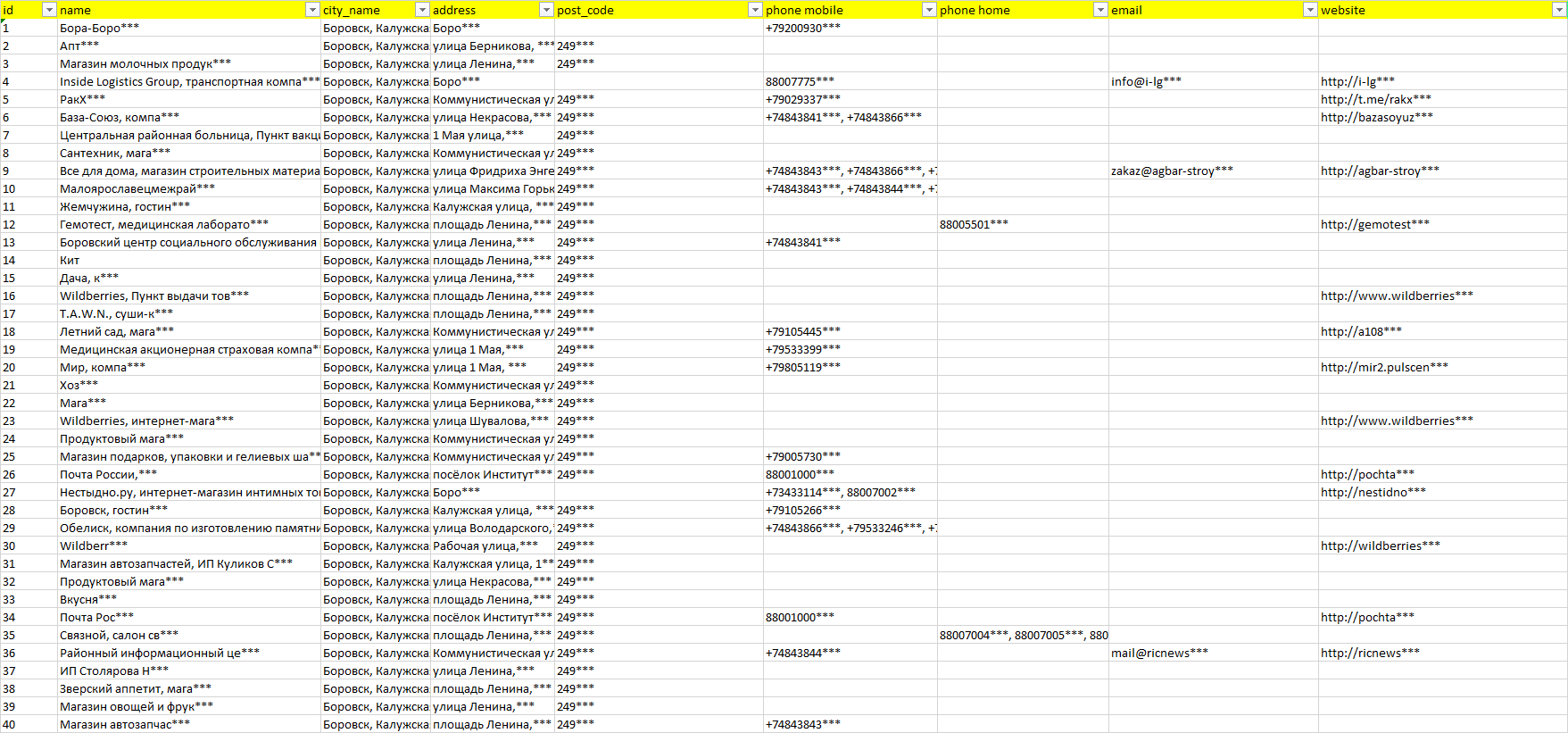 База организаций Боровск, вся Россия в формате Excel с эл. почтами, телефонами, сайтами, ссылками на соц сети, координатами и другой информацией. Скачайте демо версию, чтобы ознакомиться с данными.