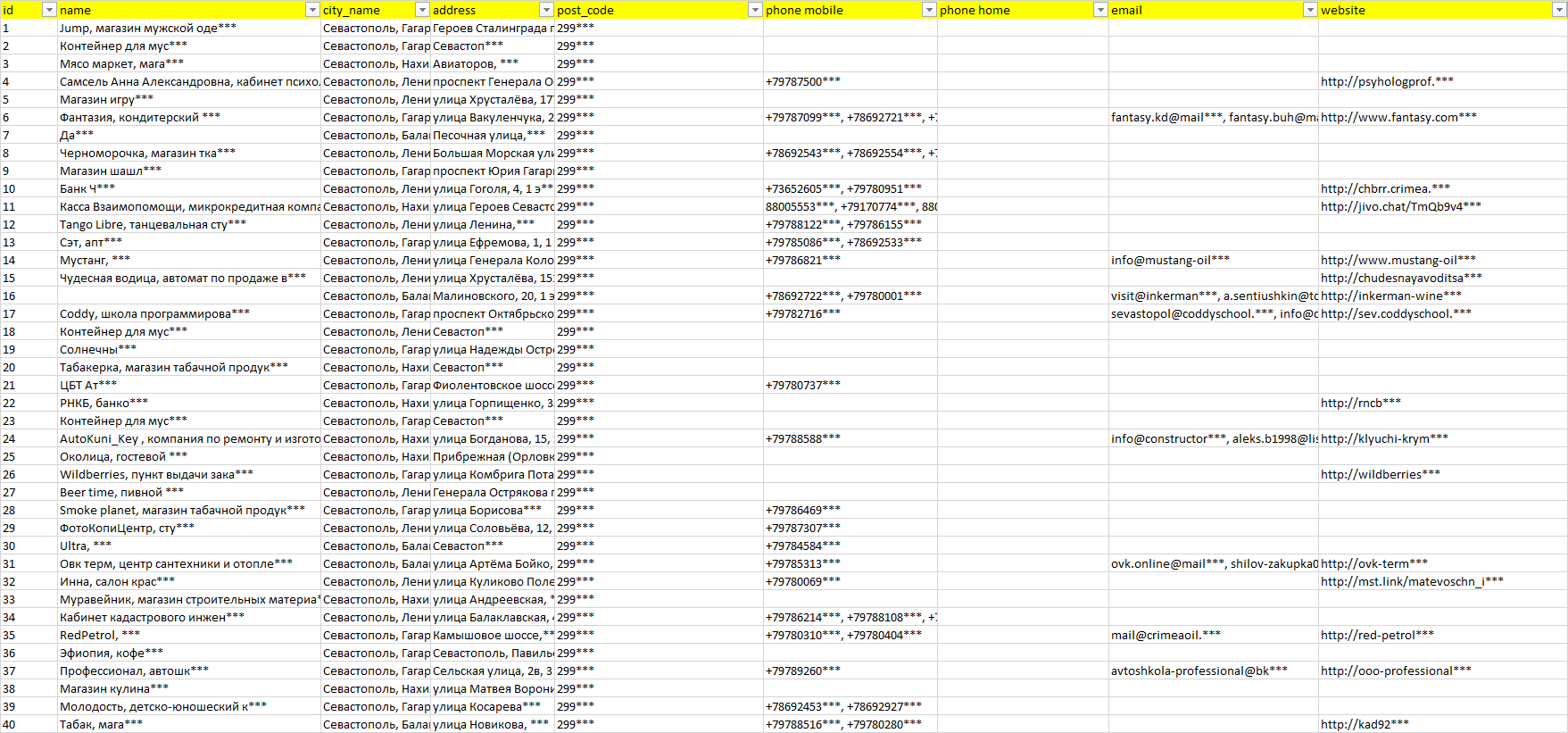 База организаций Севастополь, вся Россия в формате Excel с эл. почтами, телефонами, сайтами, ссылками на соц сети, координатами и другой информацией. Скачайте демо версию, чтобы ознакомиться с данными.