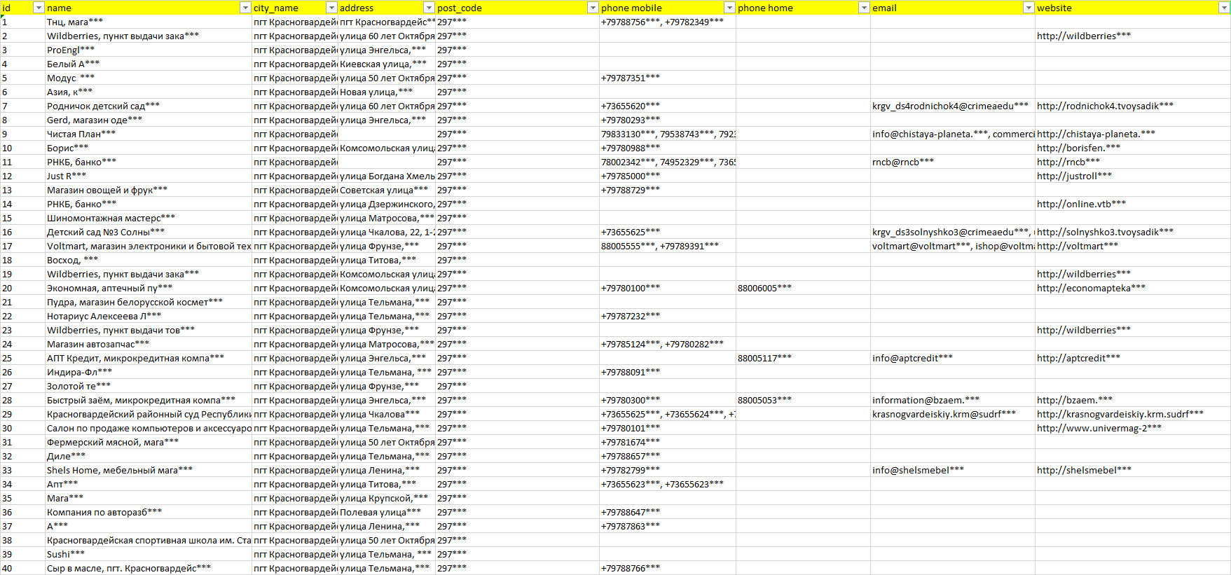 База компаний пгт Красногвардейское, вся РФ в формате Excel с эл. почтами, телефонами, сайтами, ссылками на соц сети, координатами и другой информацией. Скачайте демо версию, чтобы ознакомиться с данными.