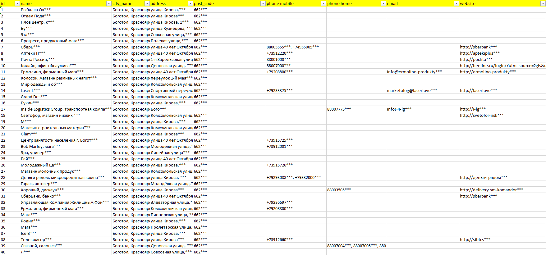 База компаний Боготол, вся РФ в формате Excel с эл. почтами, телефонами, сайтами, ссылками на соц сети, координатами и другой информацией. Скачайте демо версию, чтобы ознакомиться с данными.