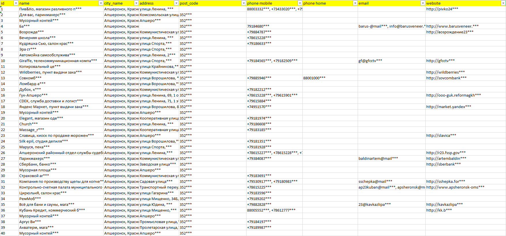 База организаций Апшеронск, вся Россия в формате Excel с эл. почтами, телефонами, сайтами, ссылками на соц сети, координатами и другой информацией. Скачайте демо версию, чтобы ознакомиться с данными.