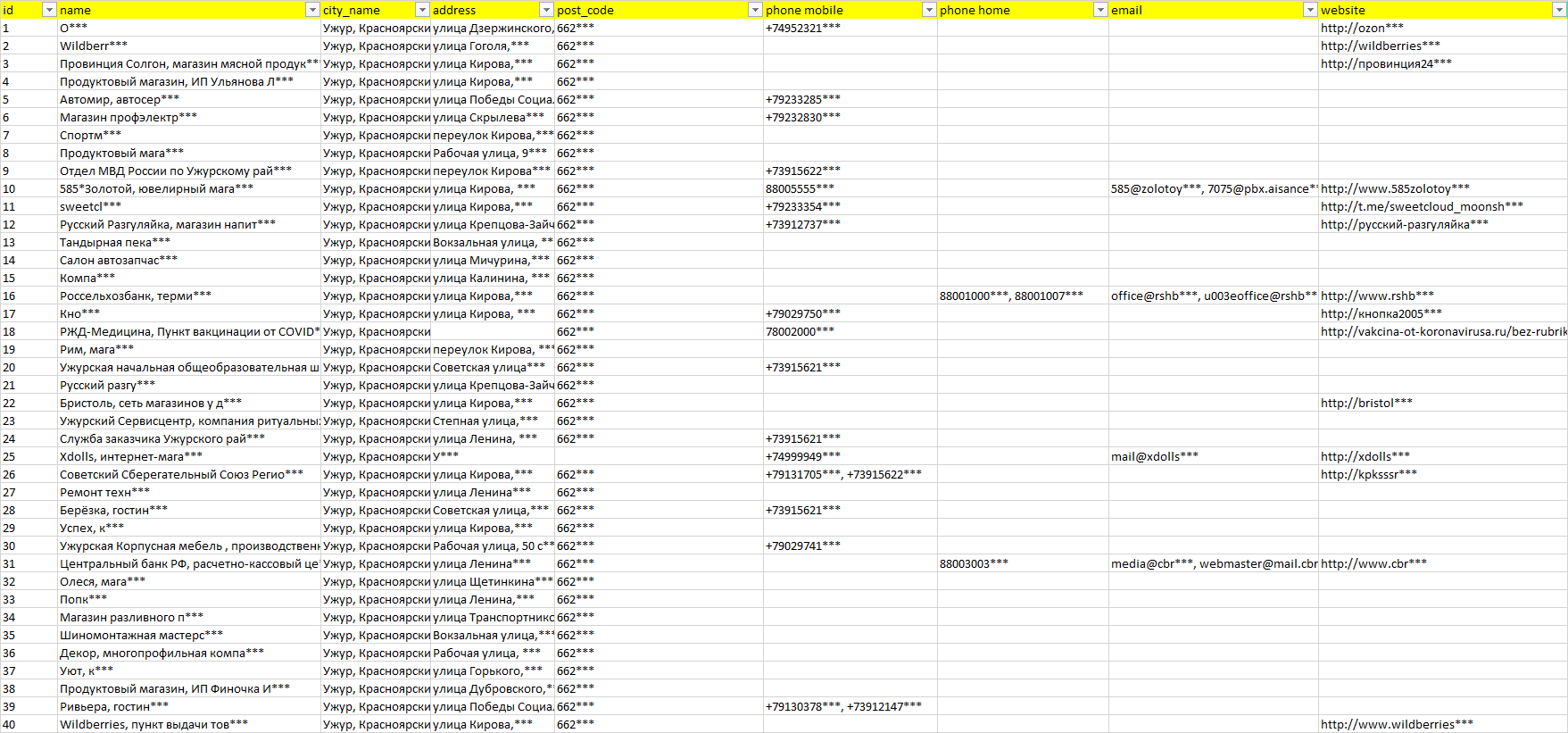 База компаний Ужур, вся РФ в формате Excel с эл. почтами, телефонами, сайтами, ссылками на соц сети, координатами и другой информацией. Скачайте демо версию, чтобы ознакомиться с данными.