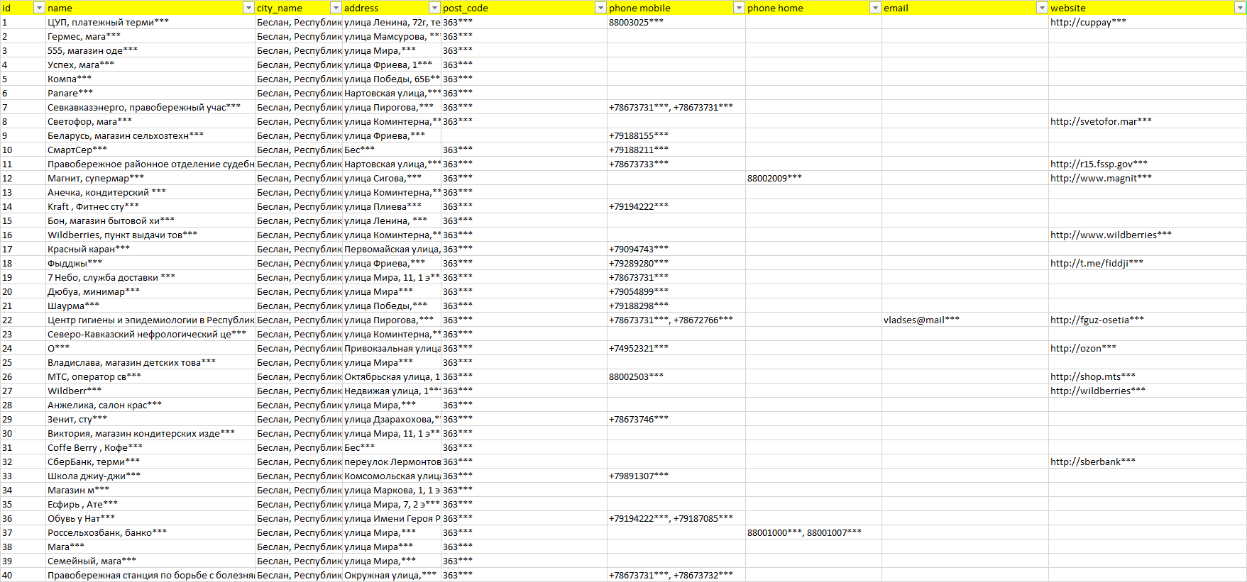 База организаций Беслан, вся Россия в формате Excel с эл. почтами, телефонами, сайтами, ссылками на соц сети, координатами и другой информацией. Скачайте демо версию, чтобы ознакомиться с данными.