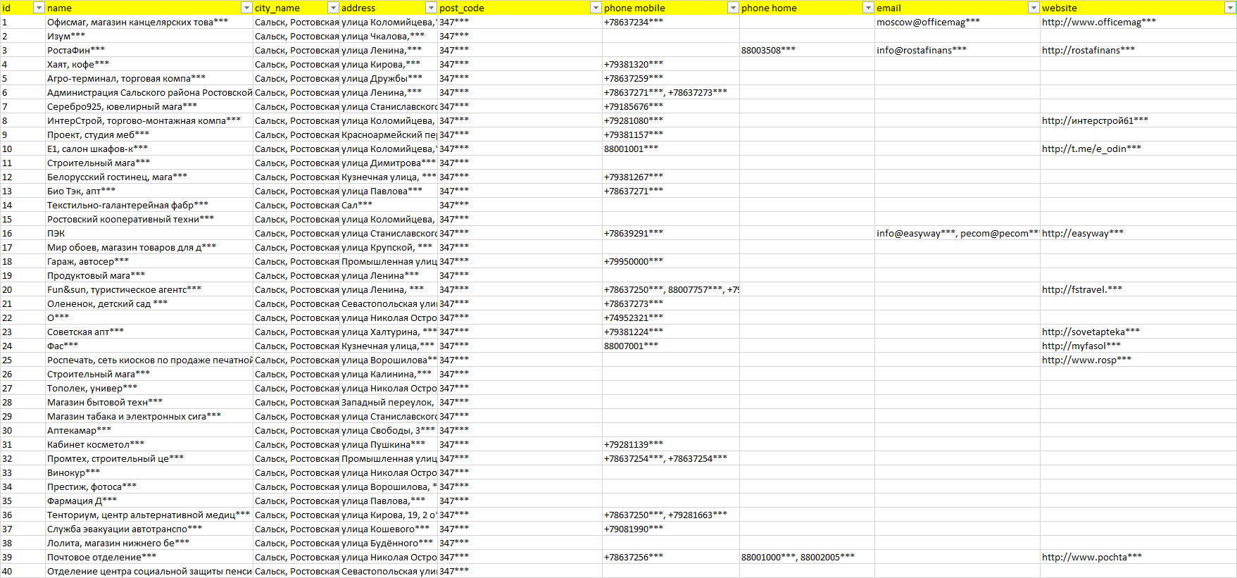 База компаний Сальск, вся РФ в формате Excel с эл. почтами, телефонами, сайтами, ссылками на соц сети, координатами и другой информацией. Скачайте демо версию, чтобы ознакомиться с данными.