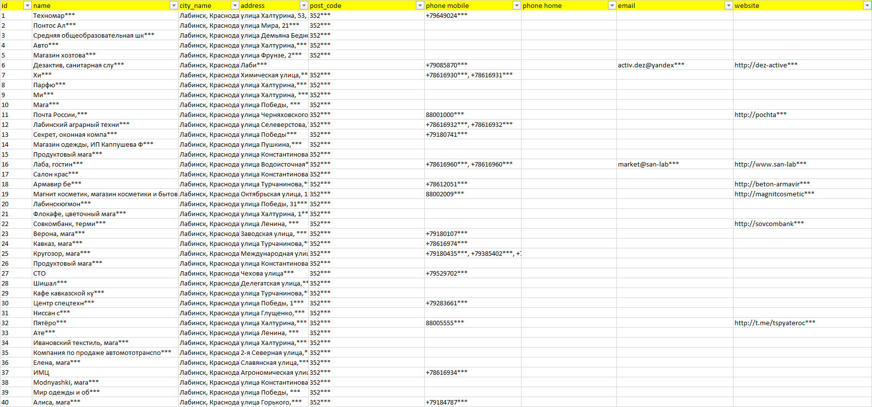 База организаций Лабинск, вся Россия в формате Excel с эл. почтами, телефонами, сайтами, ссылками на соц сети, координатами и другой информацией. Скачайте демо версию, чтобы ознакомиться с данными.