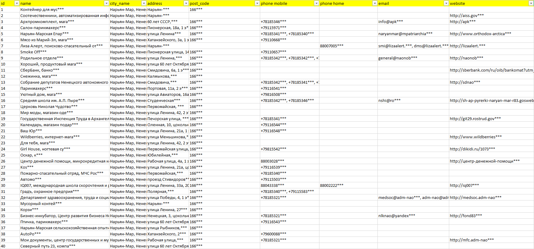 База организаций Нарьян-Мар, вся Россия в формате Excel с эл. почтами, телефонами, сайтами, ссылками на соц сети, координатами и другой информацией. Скачайте демо версию, чтобы ознакомиться с данными.