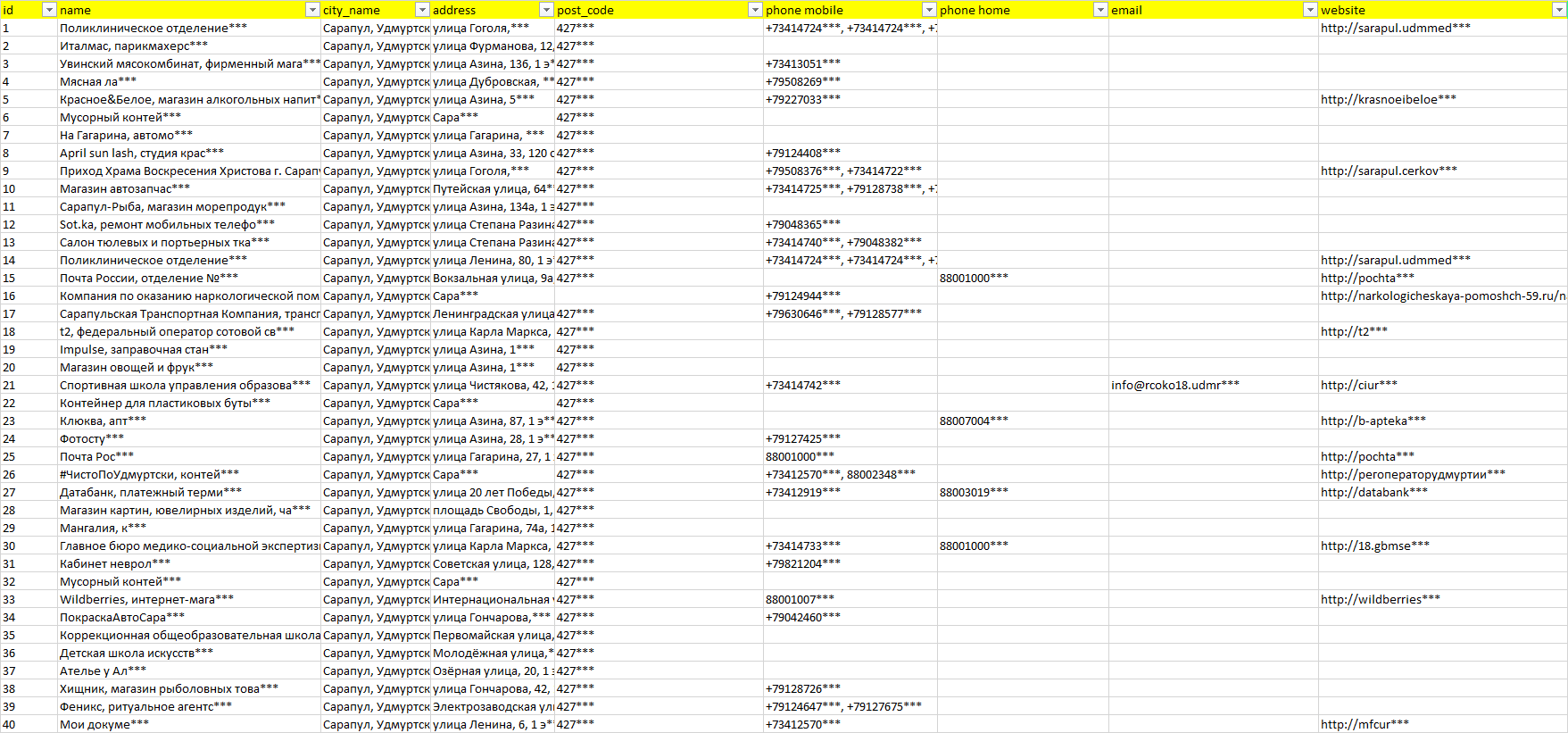 База организаций Сарапул, вся Россия в формате Excel с эл. почтами, телефонами, сайтами, ссылками на соц сети, координатами и другой информацией. Скачайте демо версию, чтобы ознакомиться с данными.