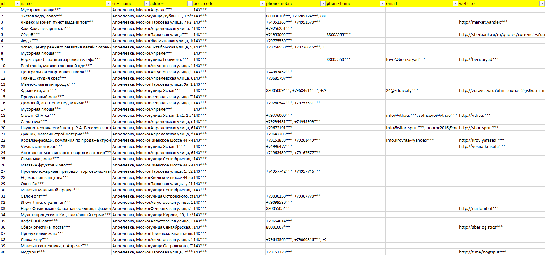 База организаций Апрелевка, вся Россия в формате Excel с эл. почтами, телефонами, сайтами, ссылками на соц сети, координатами и другой информацией. Скачайте демо версию, чтобы ознакомиться с данными.