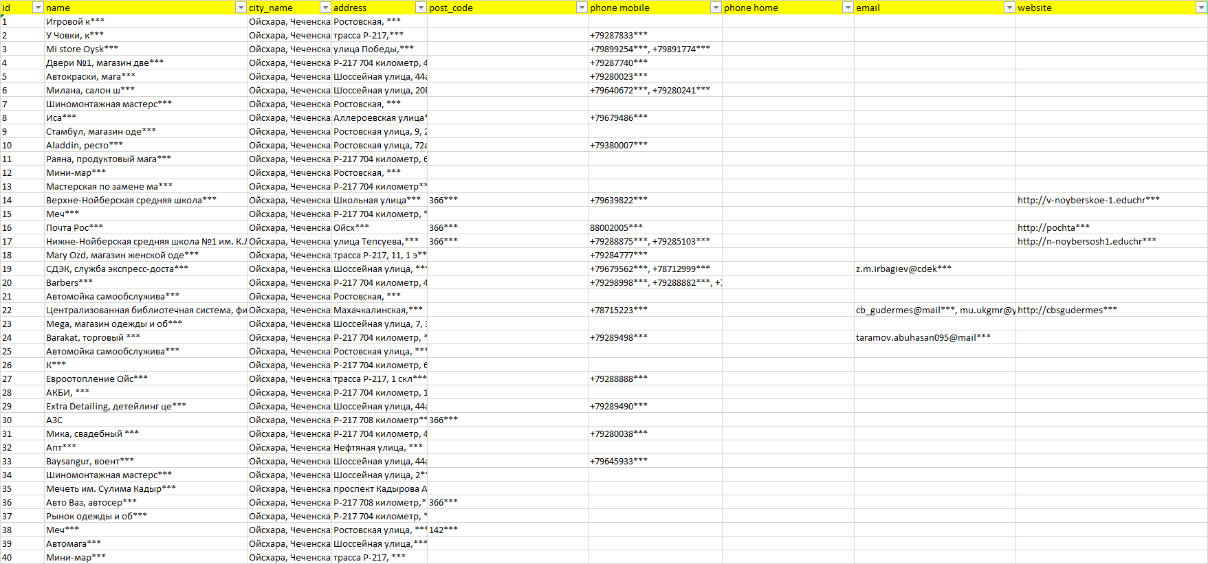 База организаций Ойсхара, вся Россия в формате Excel с эл. почтами, телефонами, сайтами, ссылками на соц сети, координатами и другой информацией. Скачайте демо версию, чтобы ознакомиться с данными.