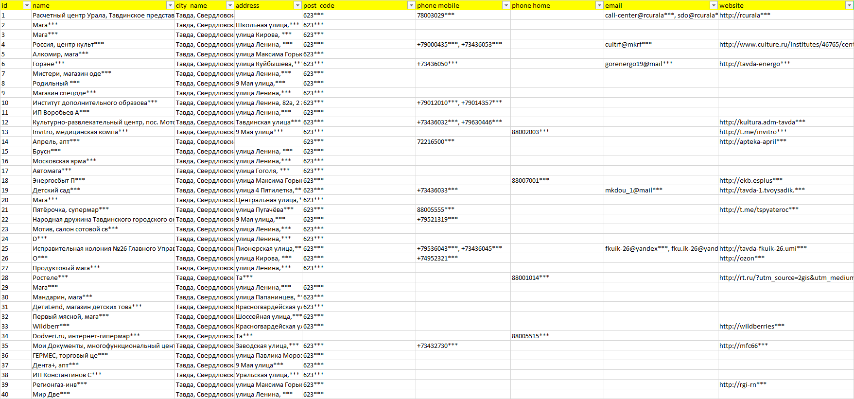 База организаций Тавда, вся Россия в формате Excel с эл. почтами, телефонами, сайтами, ссылками на соц сети, координатами и другой информацией. Скачайте демо версию, чтобы ознакомиться с данными.