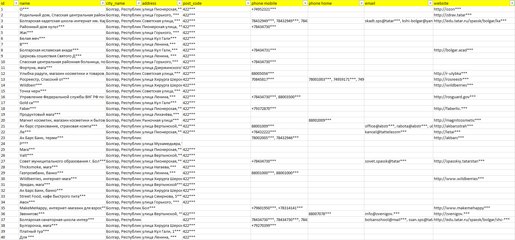 База организаций Болгар, вся Россия в формате Excel с эл. почтами, телефонами, сайтами, ссылками на соц сети, координатами и другой информацией. Скачайте демо версию, чтобы ознакомиться с данными.