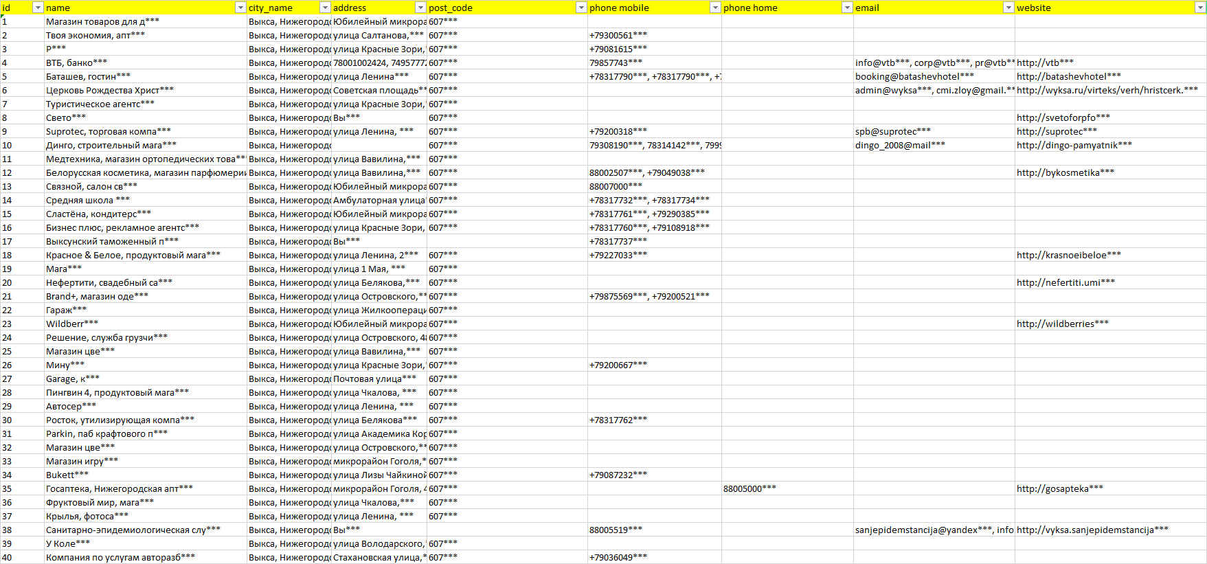 База организаций Выкса, вся Россия в формате Excel с эл. почтами, телефонами, сайтами, ссылками на соц сети, координатами и другой информацией. Скачайте демо версию, чтобы ознакомиться с данными.