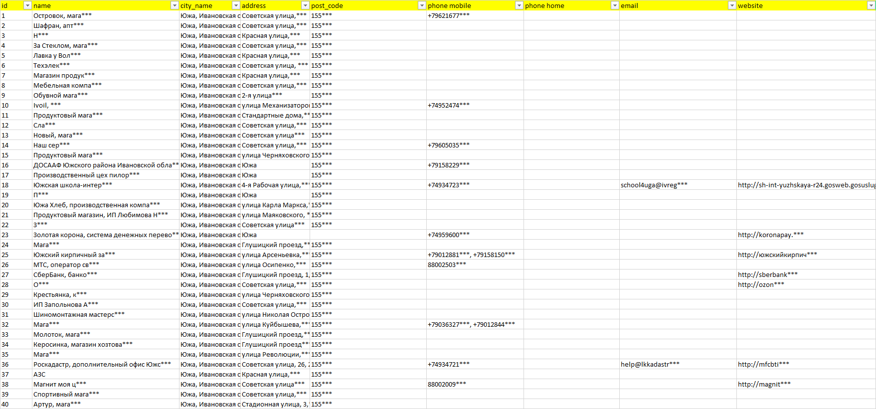 База компаний Южа, вся РФ в формате Excel с эл. почтами, телефонами, сайтами, ссылками на соц сети, координатами и другой информацией. Скачайте демо версию, чтобы ознакомиться с данными.