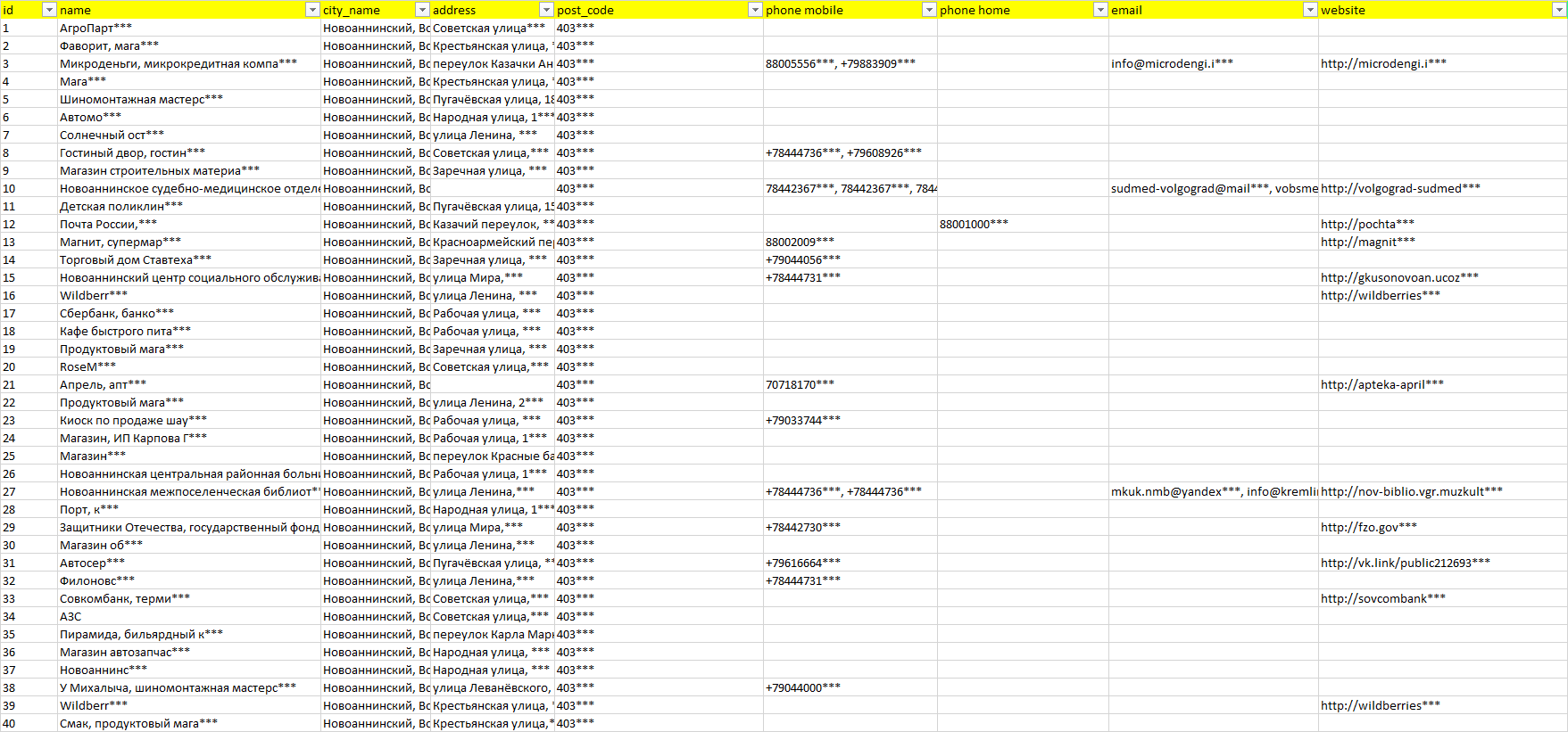 База организаций Новоаннинский, вся Россия в формате Excel с эл. почтами, телефонами, сайтами, ссылками на соц сети, координатами и другой информацией. Скачайте демо версию, чтобы ознакомиться с данными.